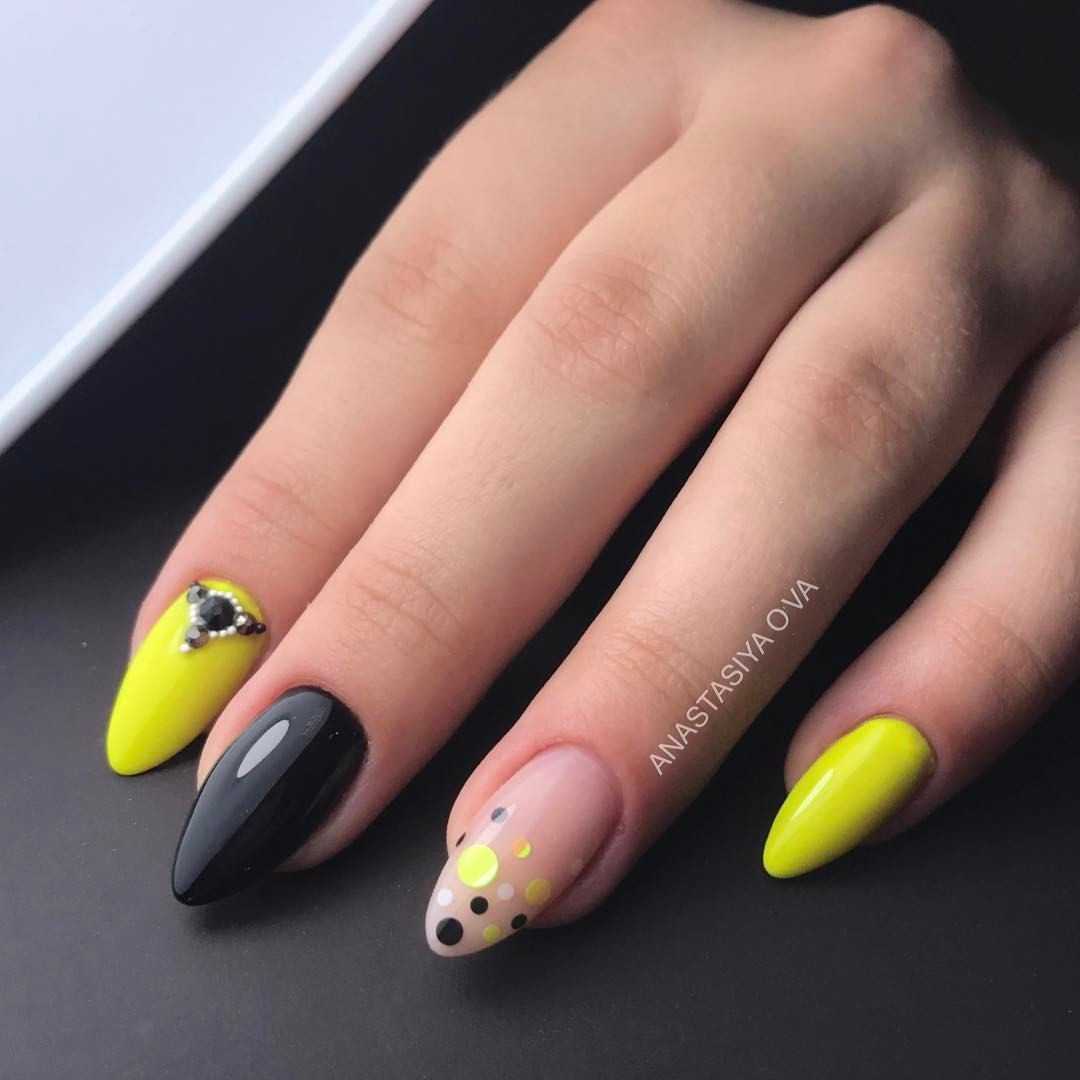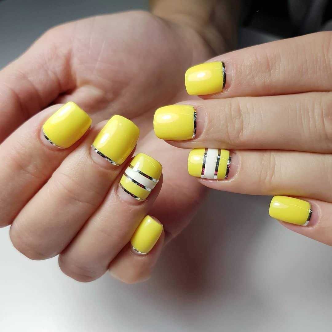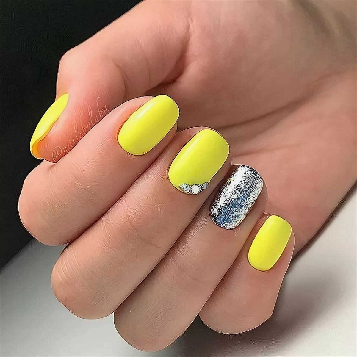 Желтый маникюр отлично смотрится в однотонном исполнении с выделением одного из ноготков серебряным глиттером, с геометрическими формами, с золотыми стразами в прикорневой зоне.