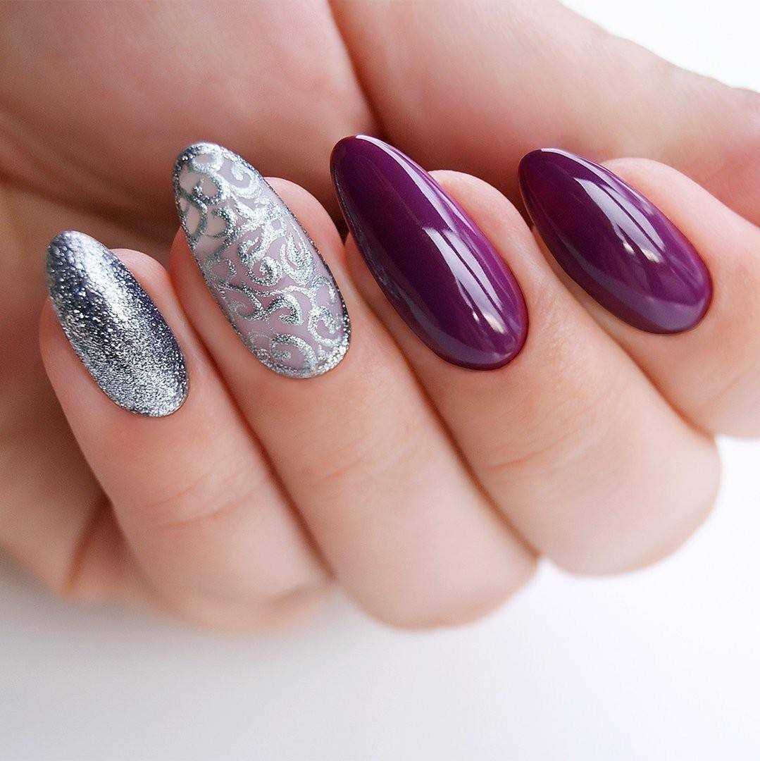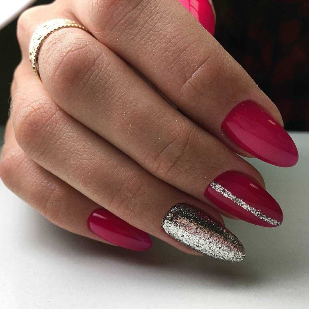 Малиновый оттенок хорошо смотрится с тепло-зеленым, розовым, красным, оранжевым, голубым, синим и фиолетовым. Все эти цвета можно комбинировать: попробуй один ноготь покрыть малиновым, второй синим или фиолетовым лаком. Такой вариант маникюра также в тренде 2019.
