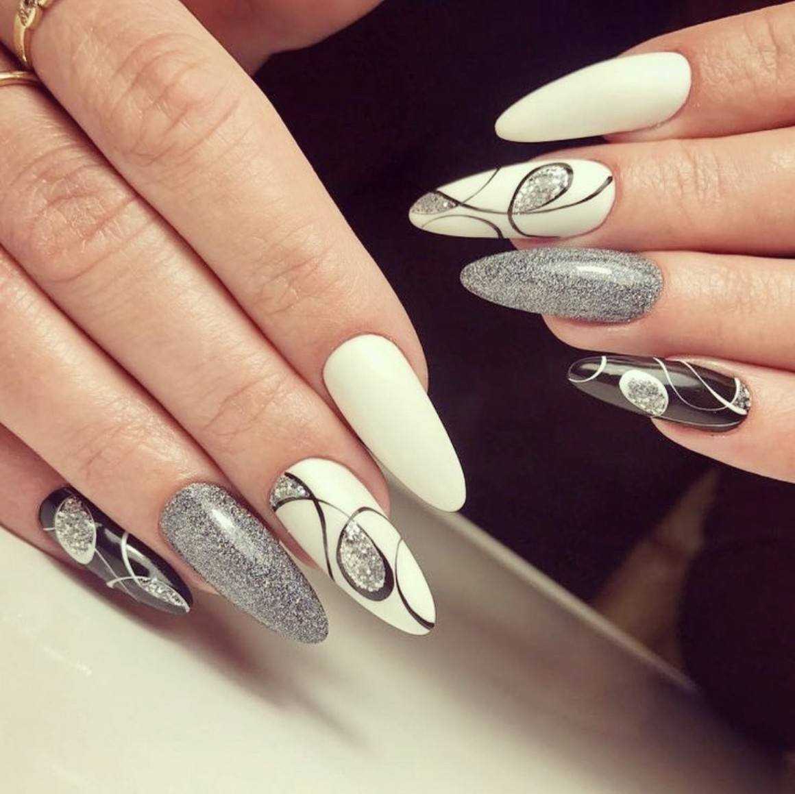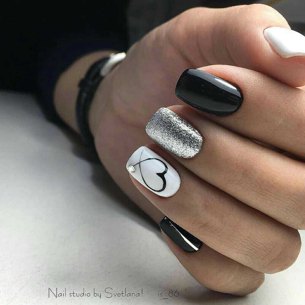 Чёрный с серебром смотрится на ноготках не менее эффектно. Для подобного оформления понадобятся чёрный лак, серебристая фольга и глиттер серебристого оттенка. Изумительно выглядит серебро в сочетании с черным в градиенте. Не выходит из моды который год и черно-красный дизайн, выполненный в градиенте.