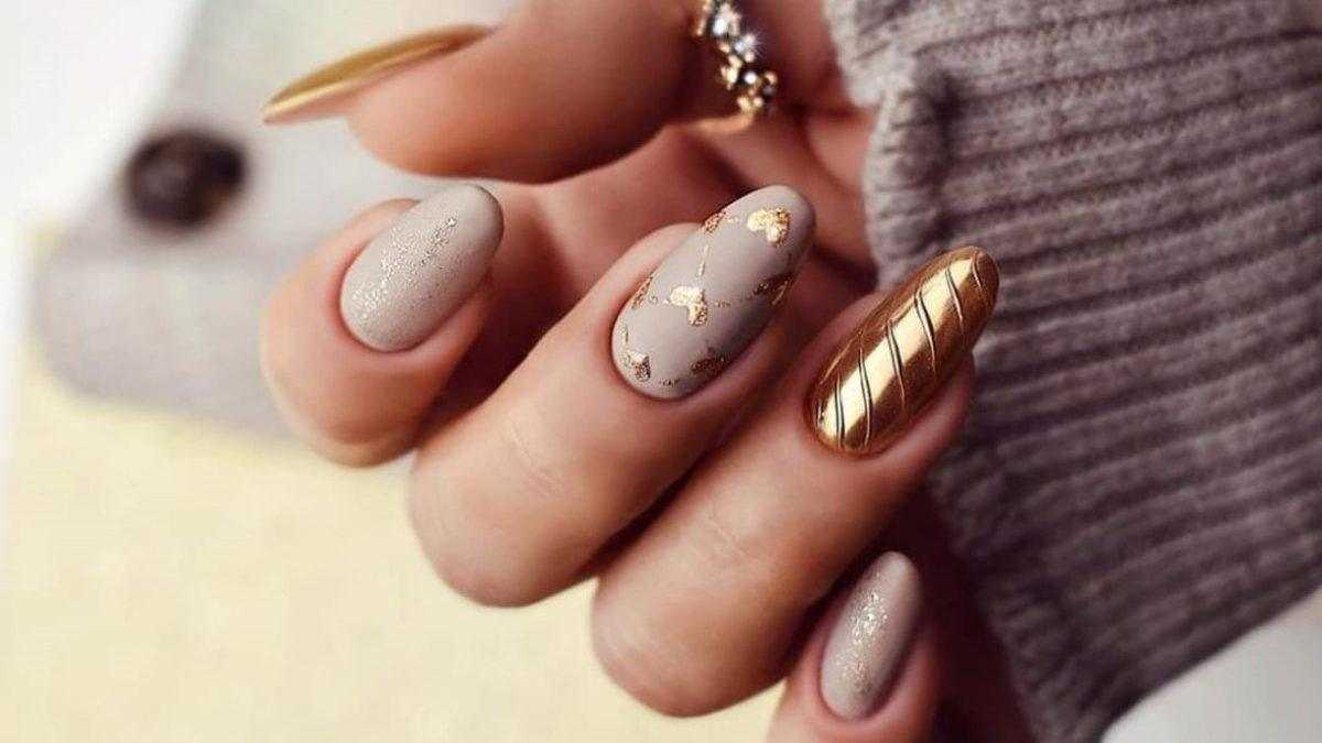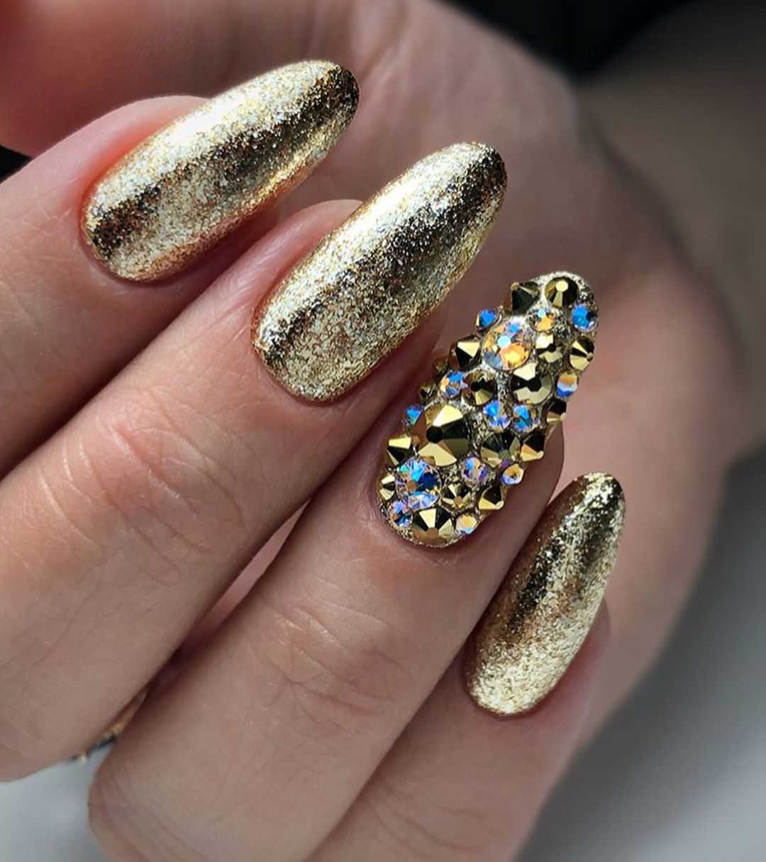 Причем такой вариант с желтоватыми частичками металла и вкраплениями золотистости станет идеальным маникюром для Нового года 2019 года.