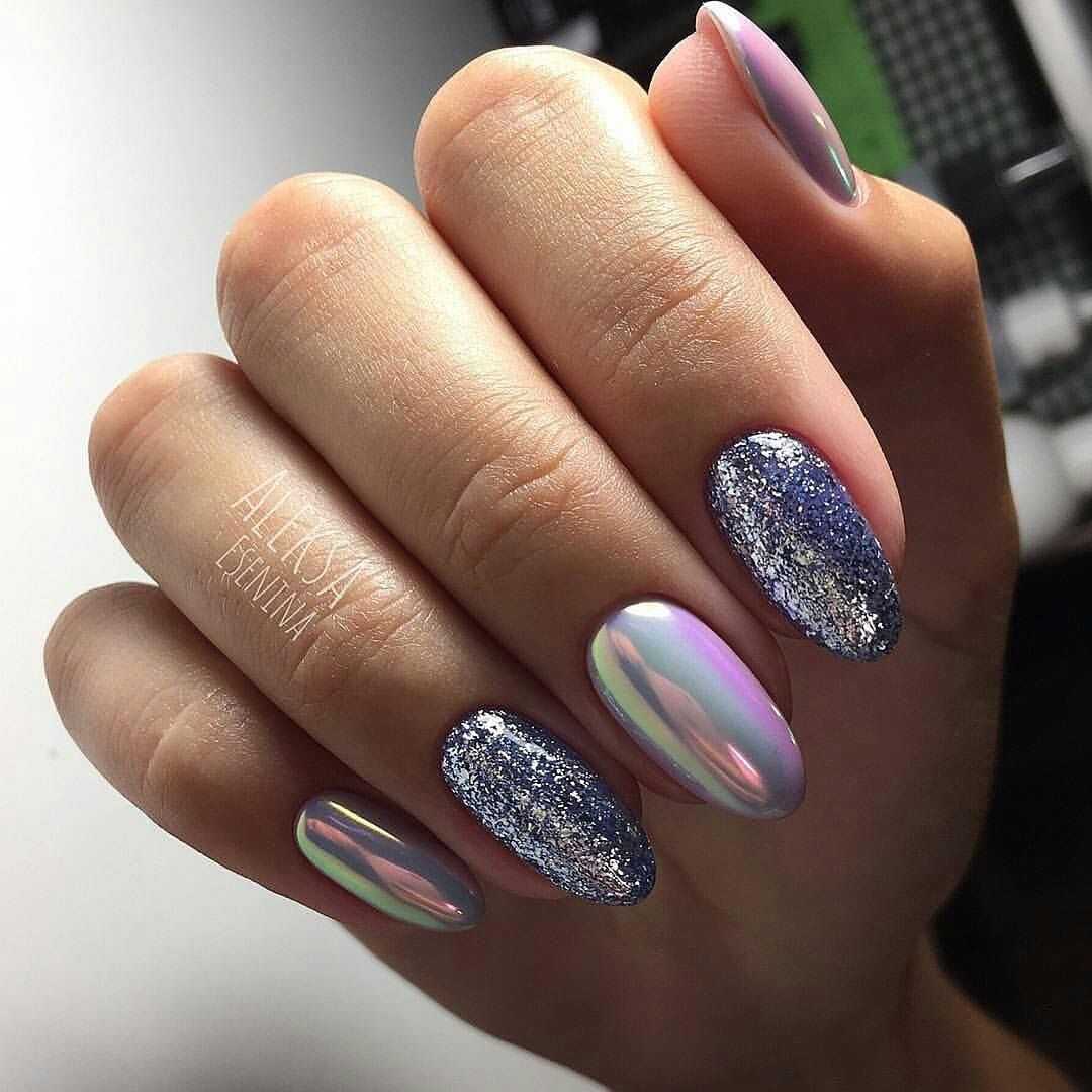 Актуальным и модным будет любое оформление в стиле металлик. Это может быть и просто нанесенный лак, и втирка, и фольга. И в данном ключе не менее популярным и любимым остается зеркальный маникюр.