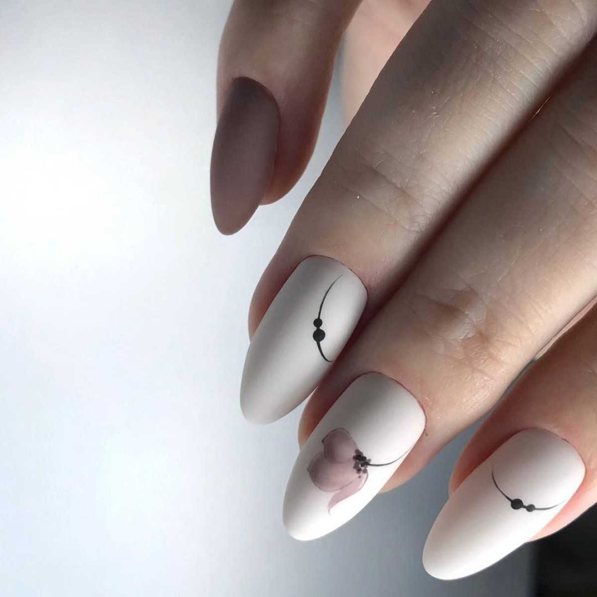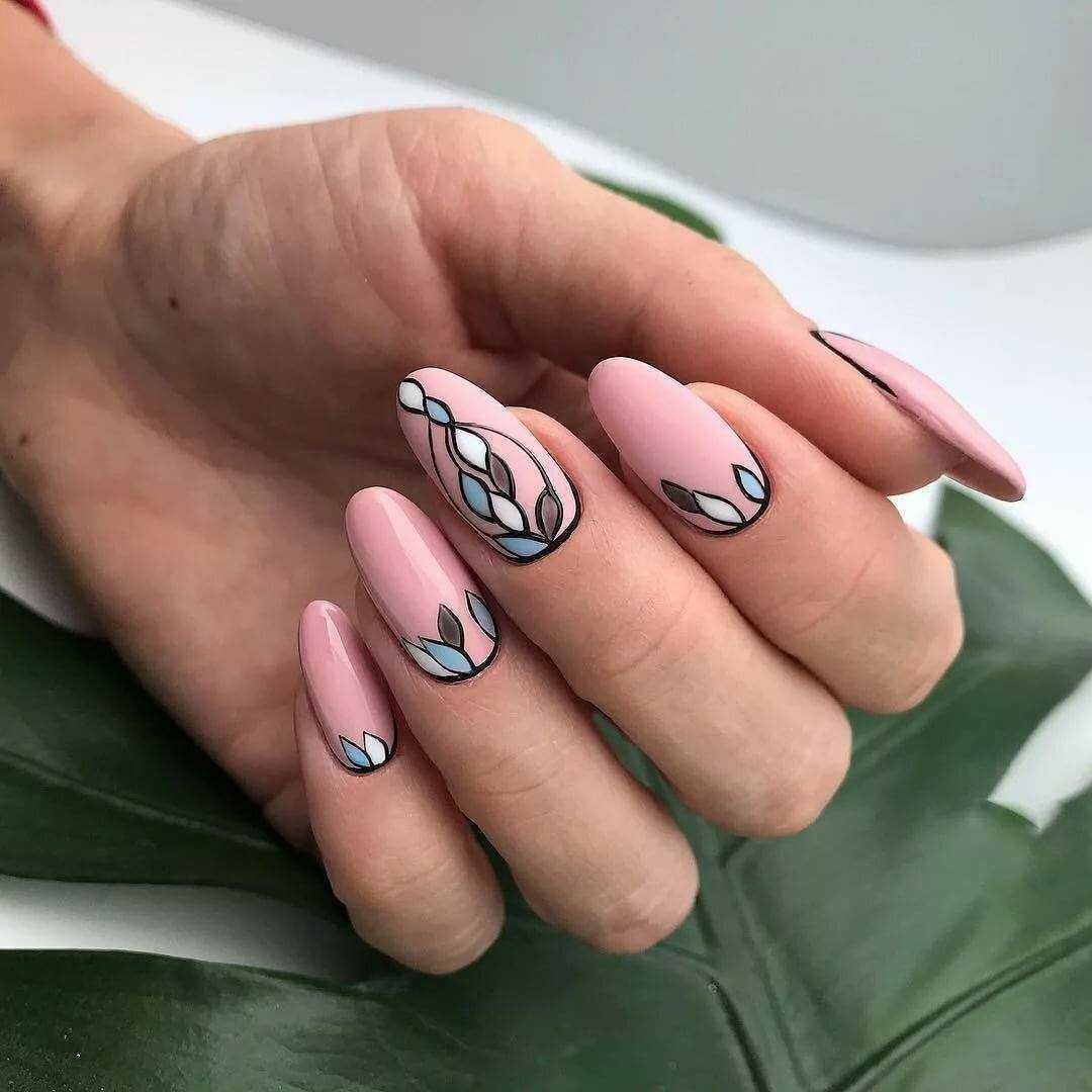 Отличным выбором будет маникюр на светлой камуфлирующей базе с растительной абстракцией и точками в бежевых и черно-белых цветах. Также прекрасно будут смотреться ногти в нюдовом оттенке с нежными желто-голубыми абстракциями на двух ноготках.