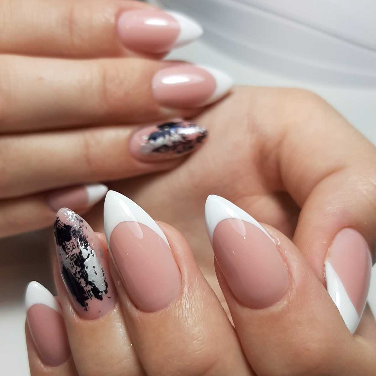 Если вы выбираете дизайн первый раз, обратите внимание на классический френч. Ровная поверхность ногтя покрывается нюдовым тоном, а кончик белым цветом