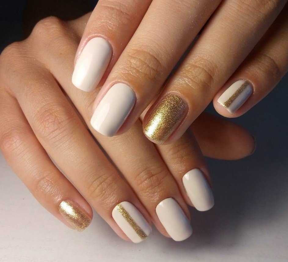Бежевый маникюр с золотом идеально смотрится на коротких ногтях. Украшенные золотой лентой для дизайна или френчем ногти отлично подойдут для свадьбы или других торжественных случаев.