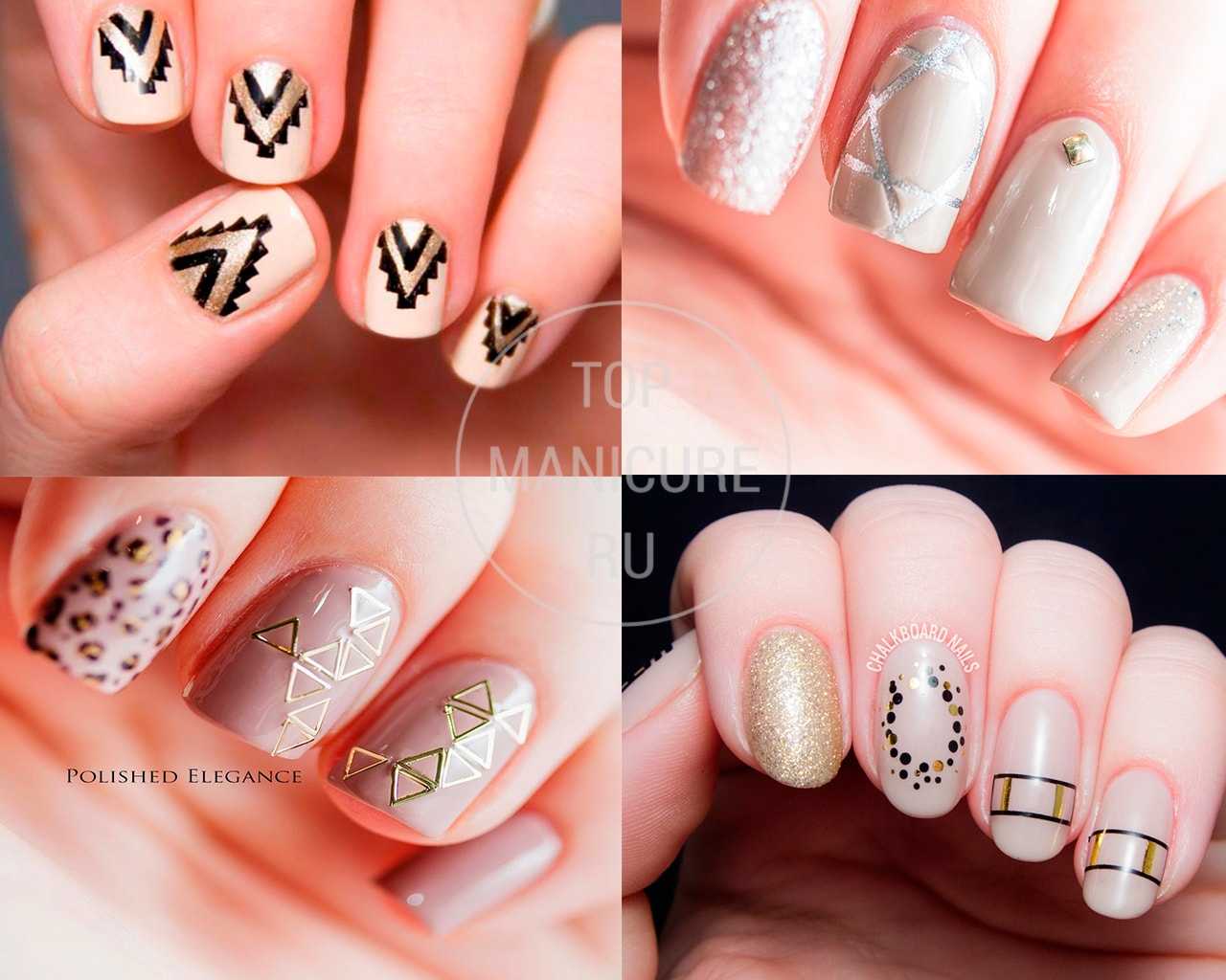 Вы можете сочетать нюдовый маникюр с геометрическими фигурами, рисунками и блестками на коротких ногтях. Этот вариант делает маникюр более интересным и привлекательным.
