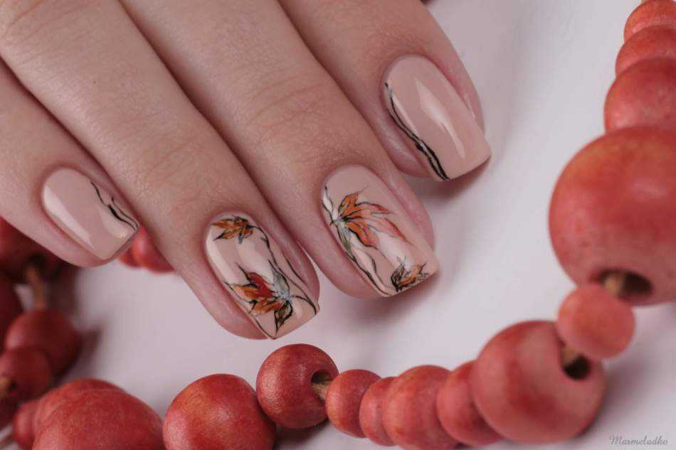 Не всегда оранжевый цвет является насыщенным и бросающимся в глаза. Он бывает нежным и легким, как дуновение весеннего ветерка. Нюдовое покрытие подходит для всех случаев жизни и придает ноготкам ухоженный вид. Разнообразить такой маникюр можно, дополнив его ненавязчивым цветочным орнаментом.