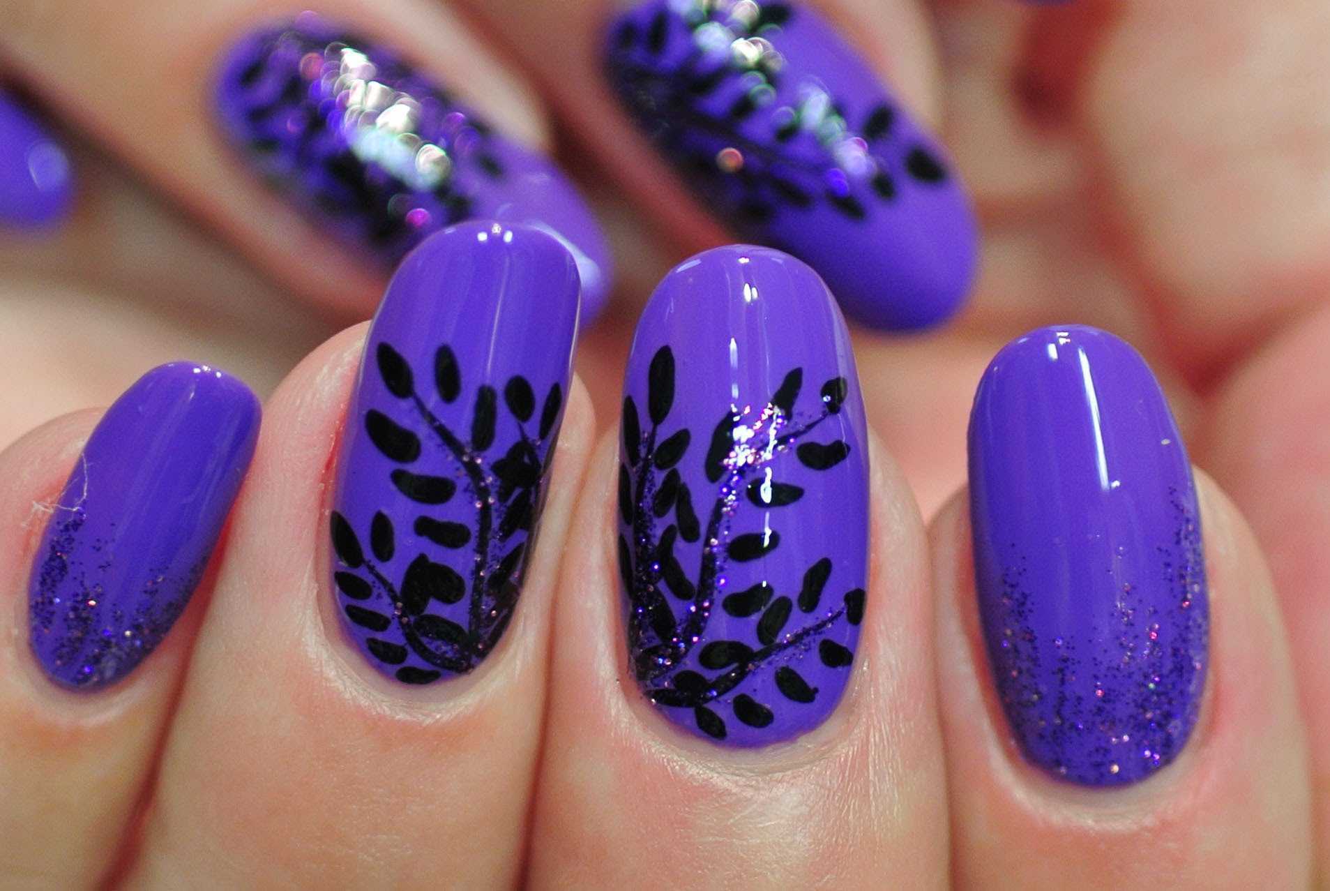 Сделайте маникюр в два цвета как описано выше, и украсьте средний и безымянный пальцы блестками или стразами. Как базовый цвет можно использовать коричневый или фиолетовый. А знаковые пальцы окрасьте бирюзовым или золотым.
