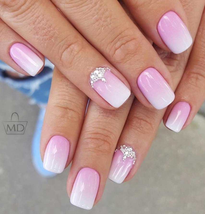 Минималистичный маникюр, напоминающий классический френч, но с легким эффектом градиента. Здесь прослеживается сочетание белого и розового оттенков. Это самый нежный вариант дизайна для летнего маникюра. Он прекрасно сочетается с любой одеждой и подходит для всех случаев. К тому же его реализация относительно проста. Ногти такого типа подойдут женщине любого возраста.