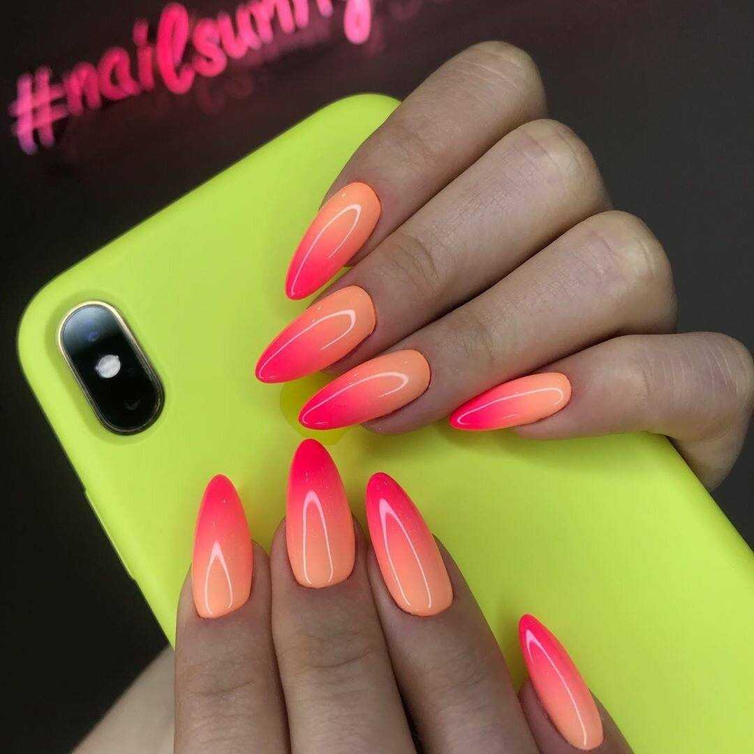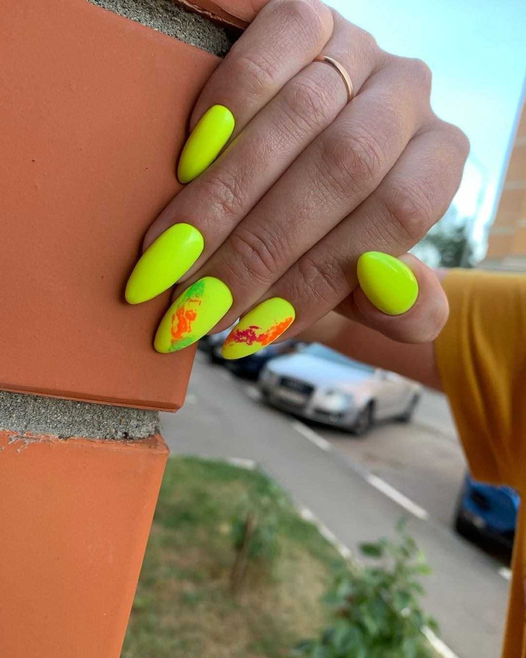 Шикарно смотрится желтый неоновый оттенок в сочетании с розовым цветом. Используйте технику “разные ручки”. Желательно не дополнять маникюр другими оттенками или декором. Неоновые тона и без того смотрятся достаточно ярко, поэтому дизайн лишь усложнит нейл-арт.