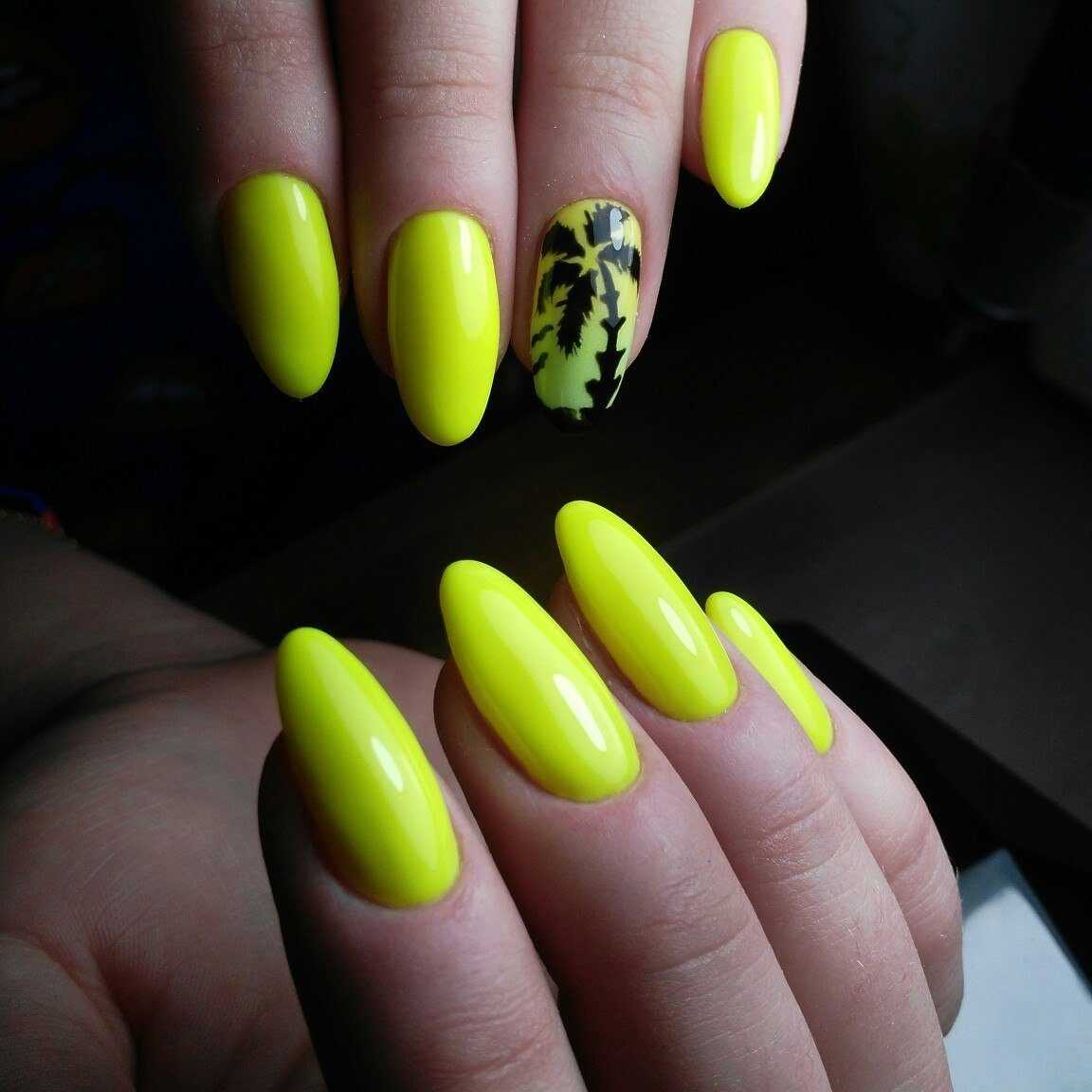 Желтый оттенок вновь на пике популярности. Мягкий и нежный цвет особенно актуален в летний период, в остальные сезоны на его смену приходит горчичный цвет. Полное покрытие ногтей неоновым желтым цветом подходит далеко не всем. Дизайн выглядит экстравагантно и очень ярко, поэтому выполнять его для повседневного образа не рекомендуется.