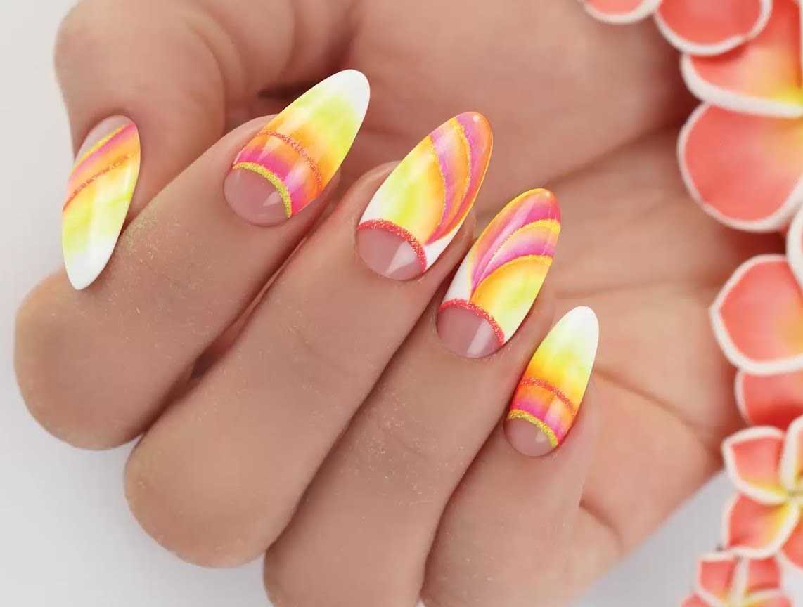 Всеми любимый дизайн ногтей, который остается модным и летом 2022 г. Нейл-мастера советуют покрасить линию «улыбки» яркими цветами. Можно даже сделать радужный маникюр. Чем ярче, тем лучше. В приоритете следующие оттенки: