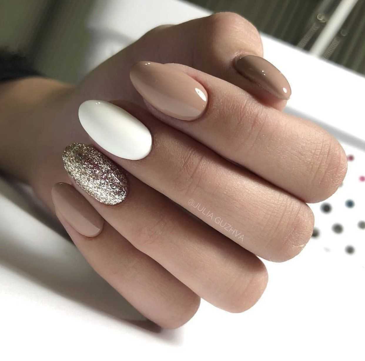 На нюдовом фоне красиво выглядит растяжка блестками, дизайн с геометрией, флористикой. Под блестящий декор обычно выделяется 1-2 ноготка, остальные же покрываются однотонным нюдовым оттенком. В однотонном исполнении красиво выглядит кофейный, серый, бежевый, молочный цвета. При этом можно без опасений использовать золотой глиттер. В сочетании с нюдовыми тонами он будет смотреться сдержаннее и мягче.
