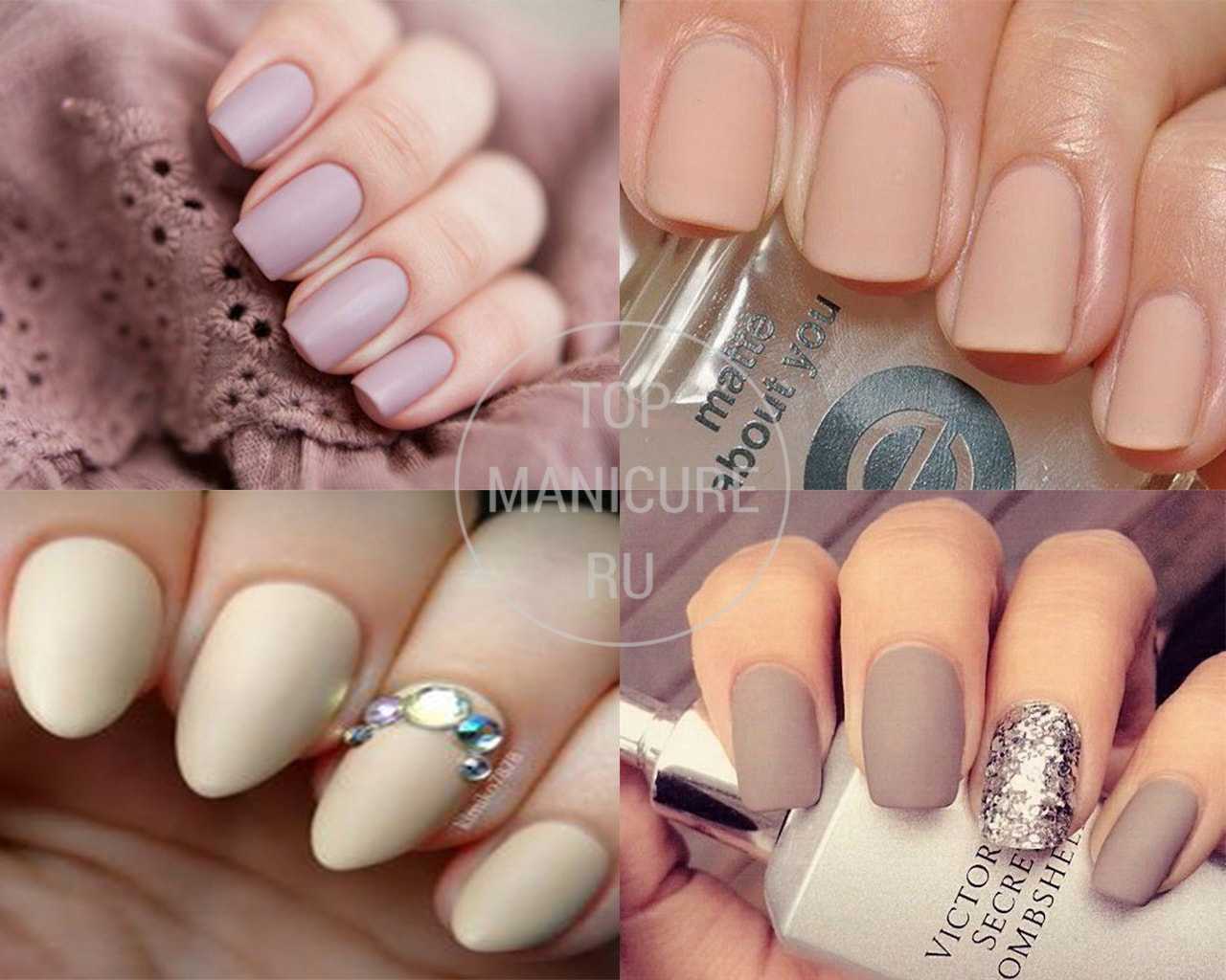 Модные нюдовые маникюры часто подразумевают матовую поверхность нескольких или же всех ногтей. В данном случае спокойный цвет можно обыграть разницей фактур и игрой света на поверхности. Варианты: