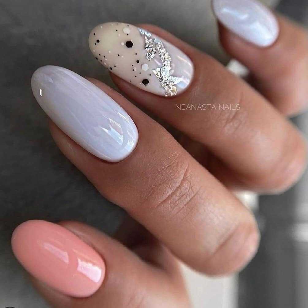 Металлический блеск — один из самых востребованных дизайнов, поэтому, если есть желание сделать простой, но модный дизайн, фольга будет идеальным решением. Это отличный вариант на вечерний образ. Блеск хорошо сочетается с матовым покрытием, добавляя роскоши. Используя цветную фольгу или зеркальную, можно получить разнообразный эффект.