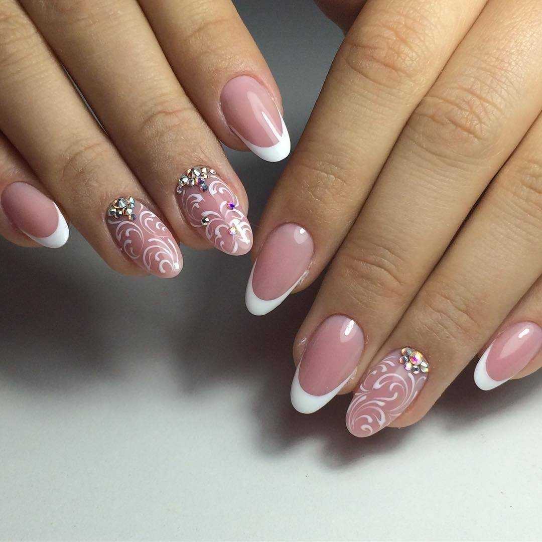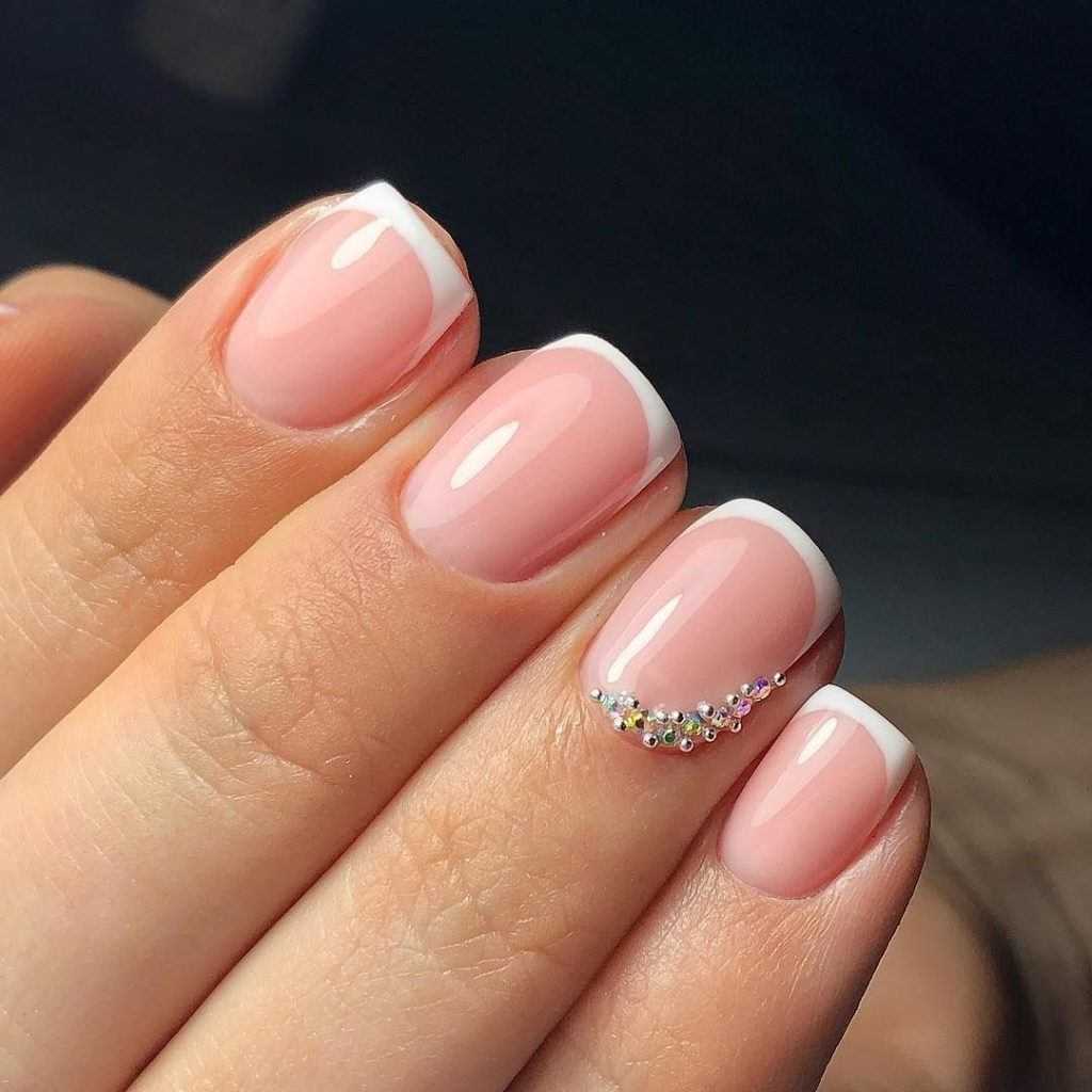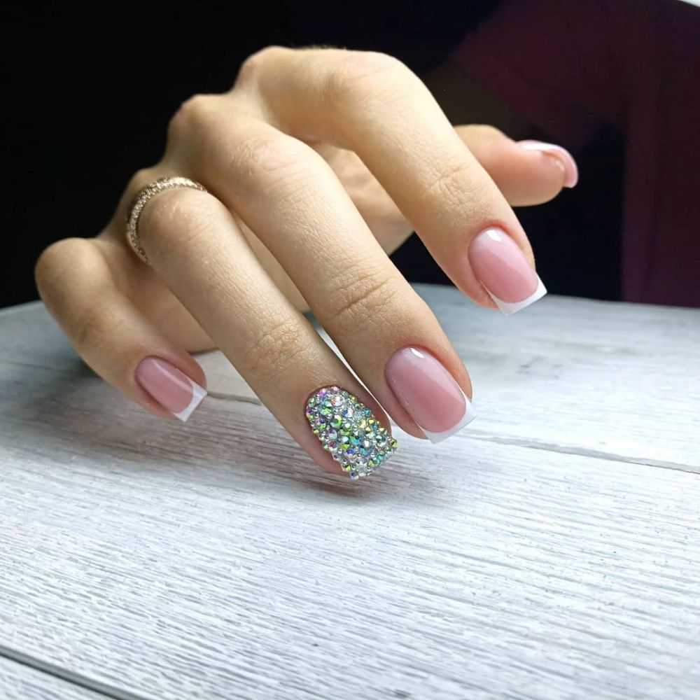 - в сочетании с французским маникюром с добавлением блесток и страз по краю ногтя;