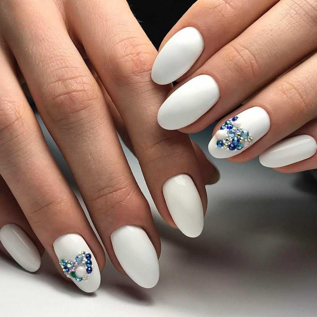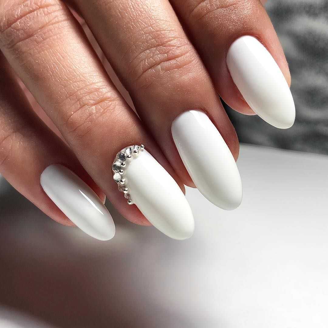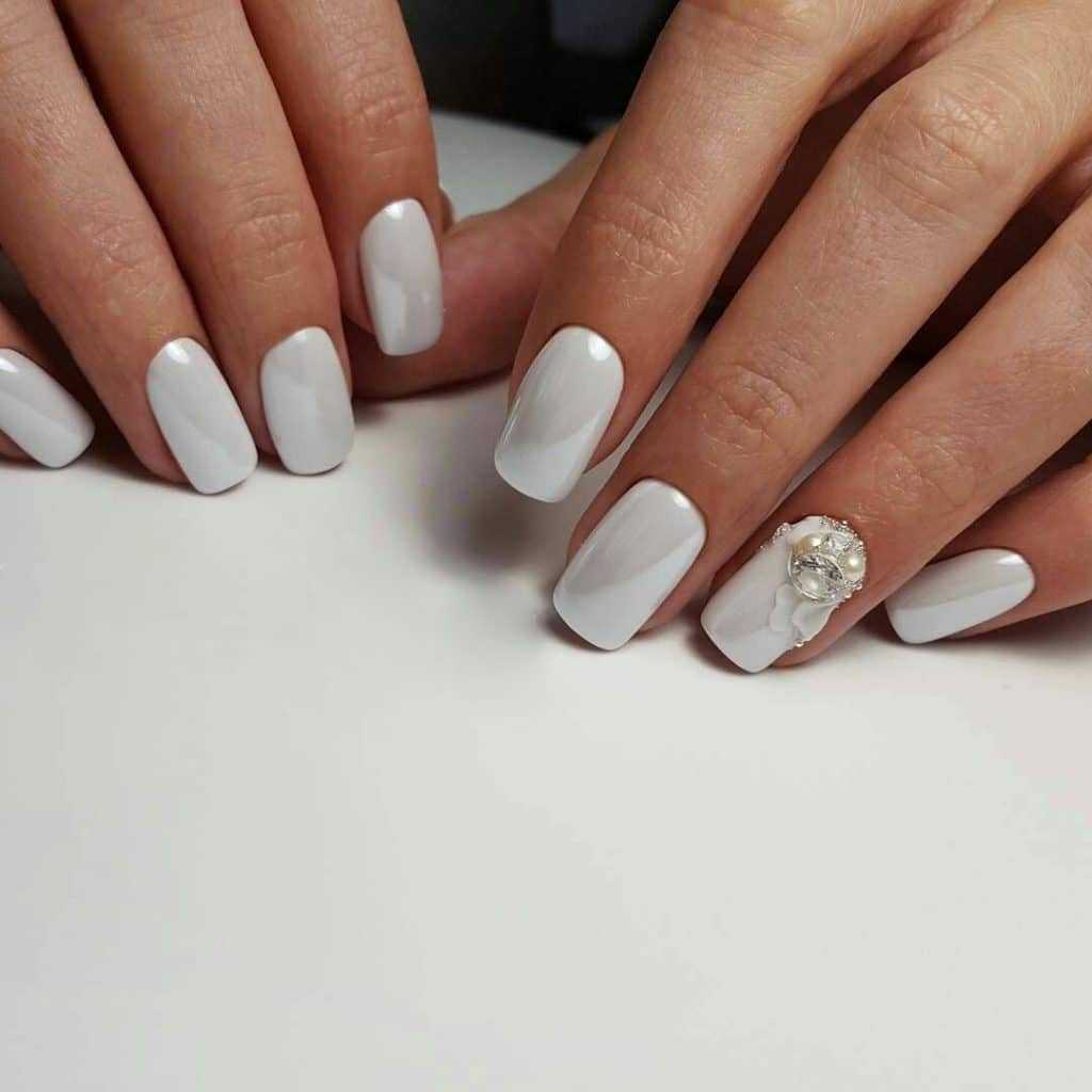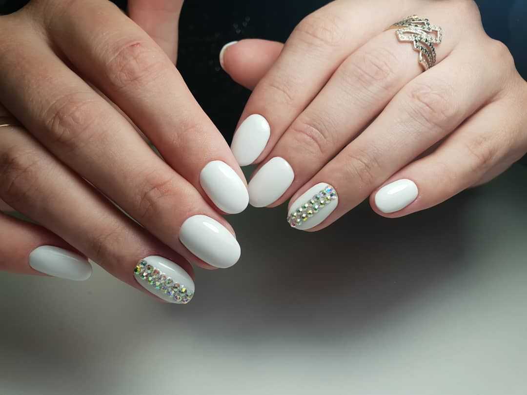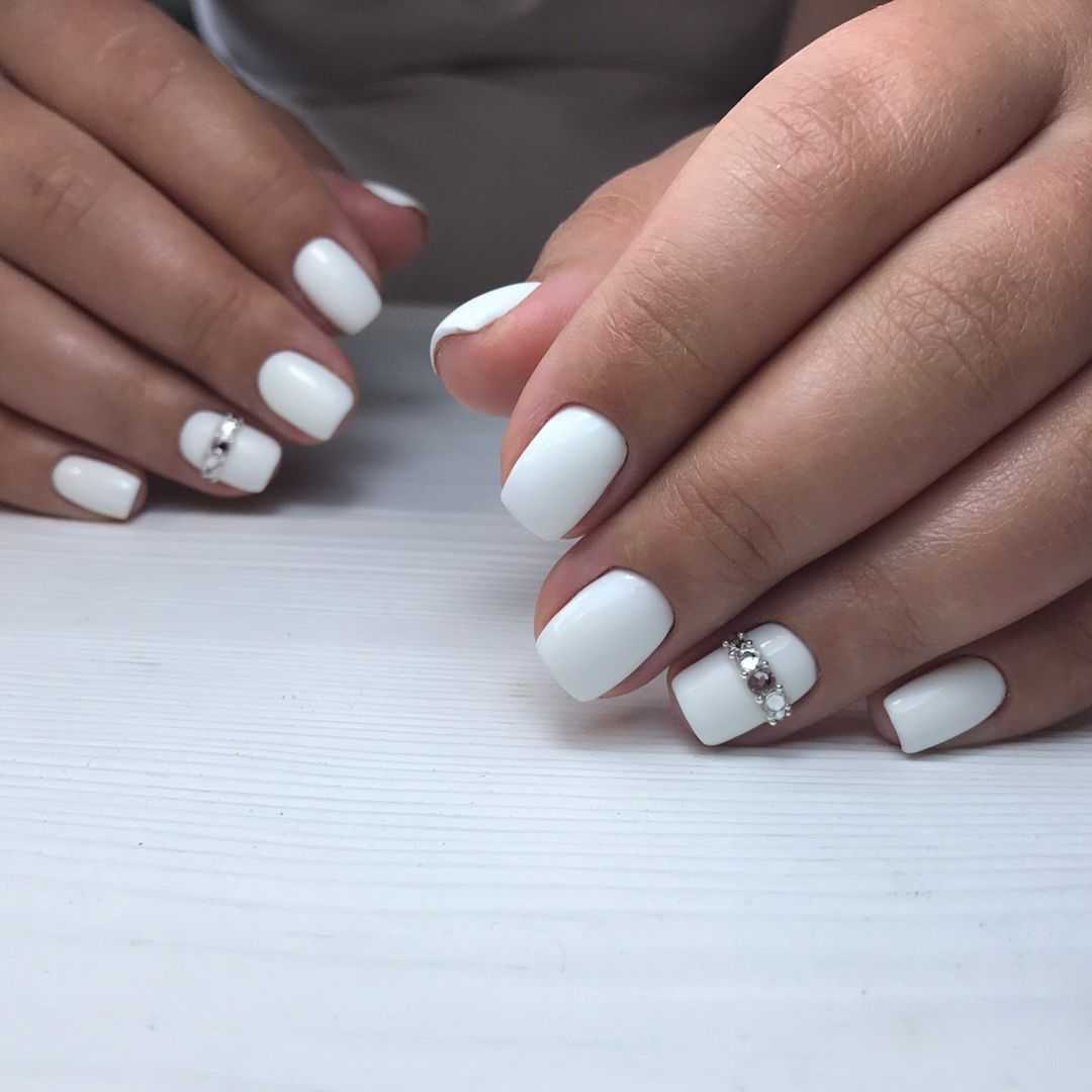 Как видите, белый маникюр может выглядеть совершенно по-разному. В данном случае играет роль не только выбранный дизайн, но и наличие дополнительных деталей. Экспериментируйте с различными вариациями покрытия и тогда оформление ногтей будет выглядеть стильно.