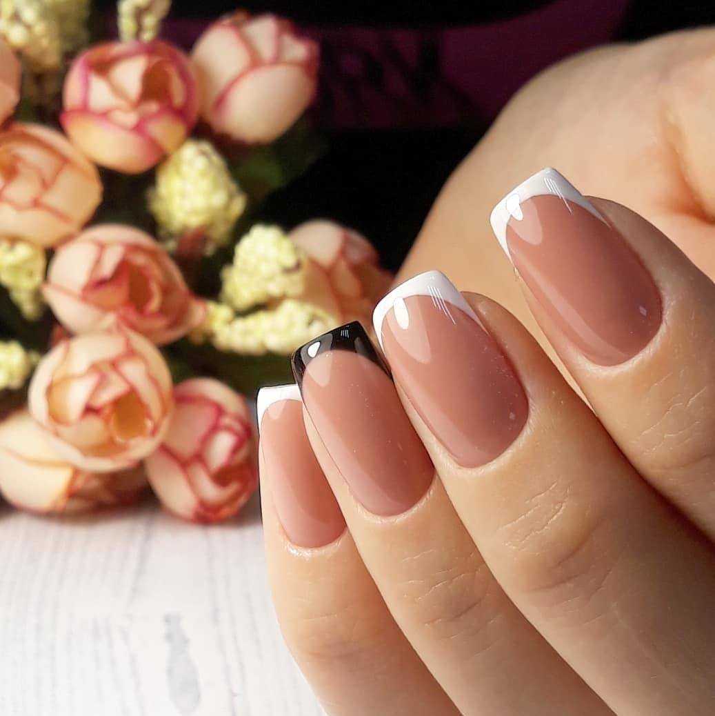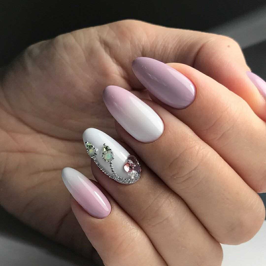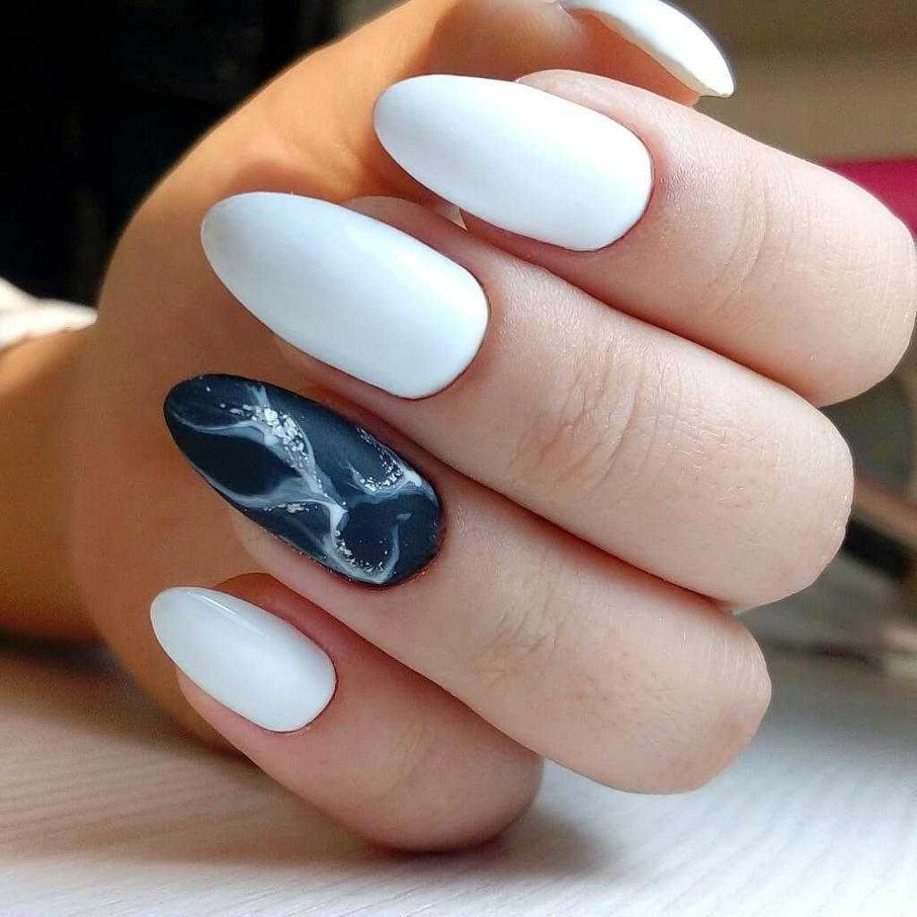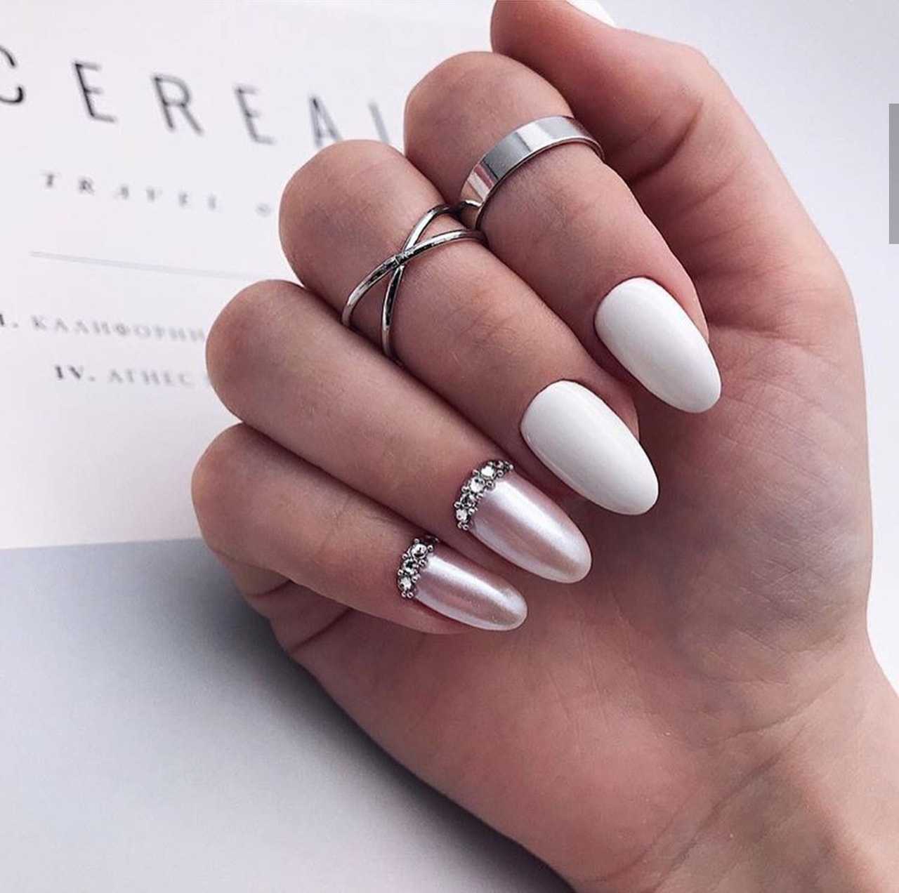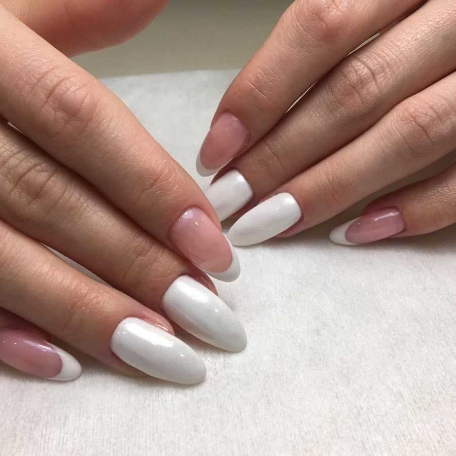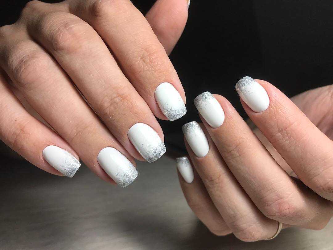 Омбре белым цветом на кончики или основу ногтя хорошо смотрится с добавлением перламутрового блеска, нежного рисунка, потали, фольги. Лунный маникюр и французский могут быть белым, цветным или даже черным.
