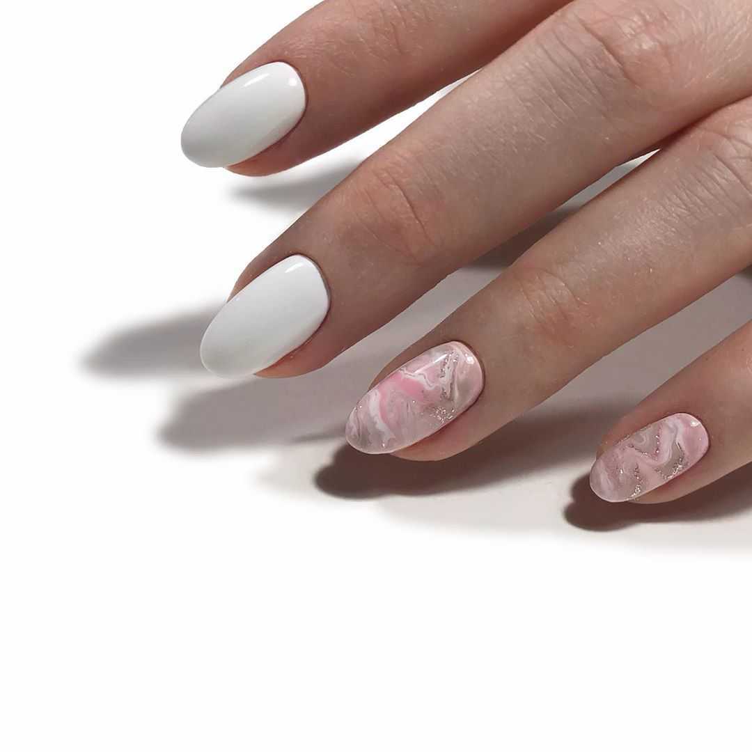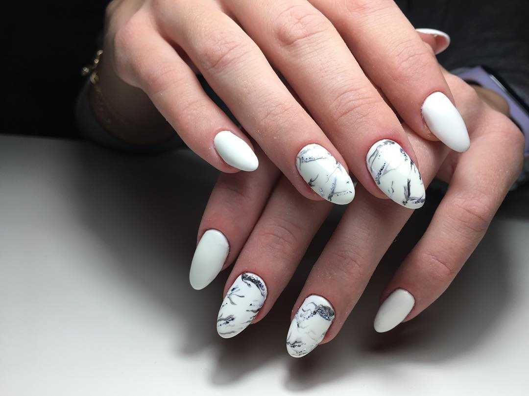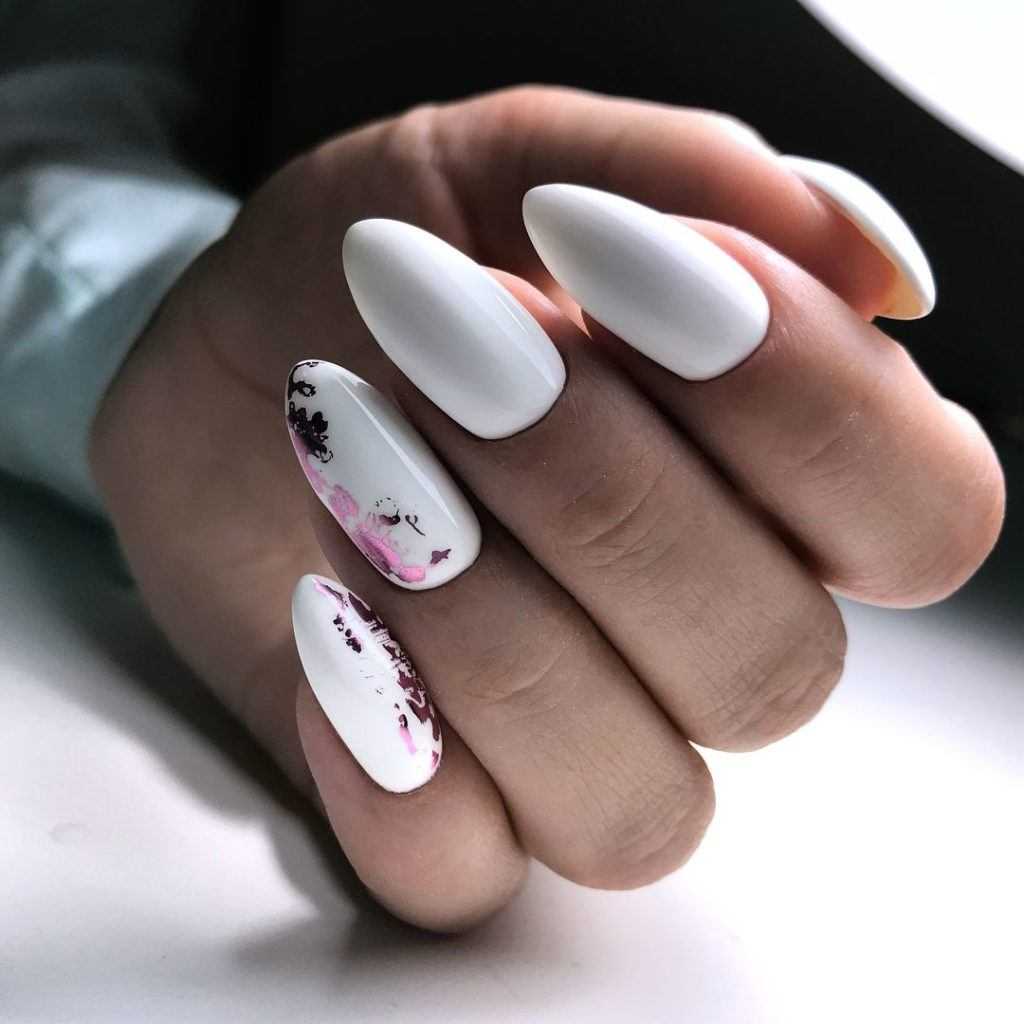 Вкрапления черными или цветными точками, пятна, картинки будут прекрасно наполнять светлый маникюр, придавая индивидуальность и неповторимость вашему образу. Хорошо подойдет тонкий белый френч, вкрапления потали, мраморный светлый дизайн. Универсальный белый подойдет для лета, осени, зимы и весны, это снежинки, цветочки, листики и перышки в дизайне, а также нейтральный фон для росписи другими цветами.