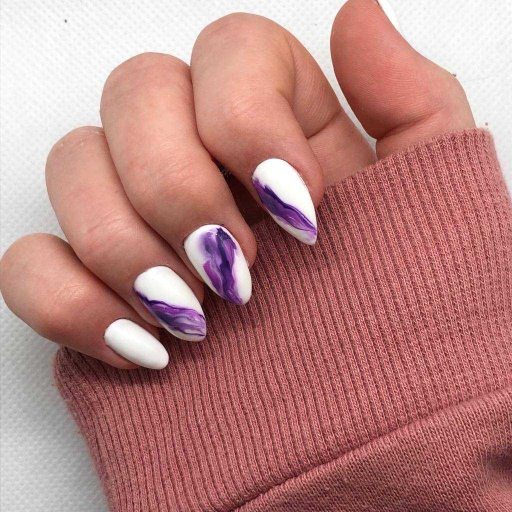 Размытые, полупрозрачные узоры смотрятся нежно и даже мило. Такой маникюр в 2022 году особенно хорошо подходит к миндальной форме, добавляет свежести. В основном на миндалевидной форме акварельные узоры делают в виде: