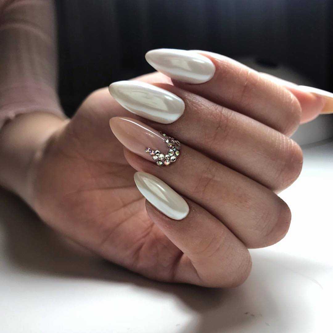 - втирка, новая технология, создающая эффект хромированных ногтей, отлично сочетается в чередовании хрома с чисто белым цветом и украшенного стразами.