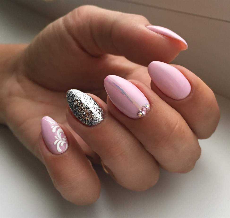 Что касается дизайна миндальных ногтей с нюдовым лаком — не стоит злоупотреблять. Это должны быть незначительные акценты в виде небольшого количества блесток, втирки, рисунка или наклейки.