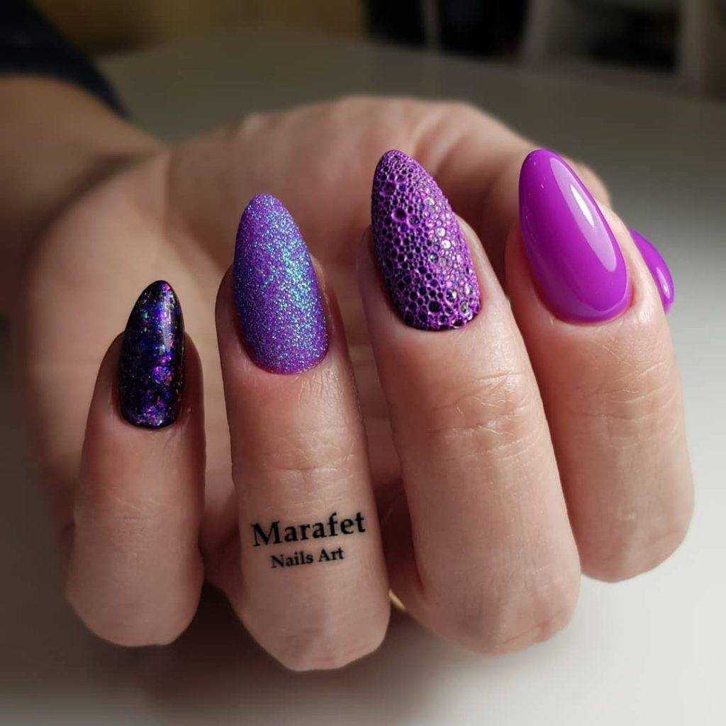 Пятое место в модном весеннем nail-параде, в этом году делят между собой дизайн с блестками и дизайн со стразами. Как и несколько сезонов подряд, в тренде остается выделение блестками одного или двух ноготков. Плюс добавьте к этому модный цвет гель-лака, и топовый дизайн готов.