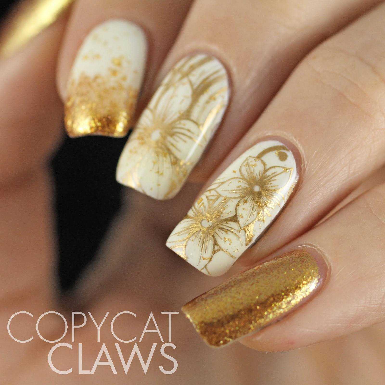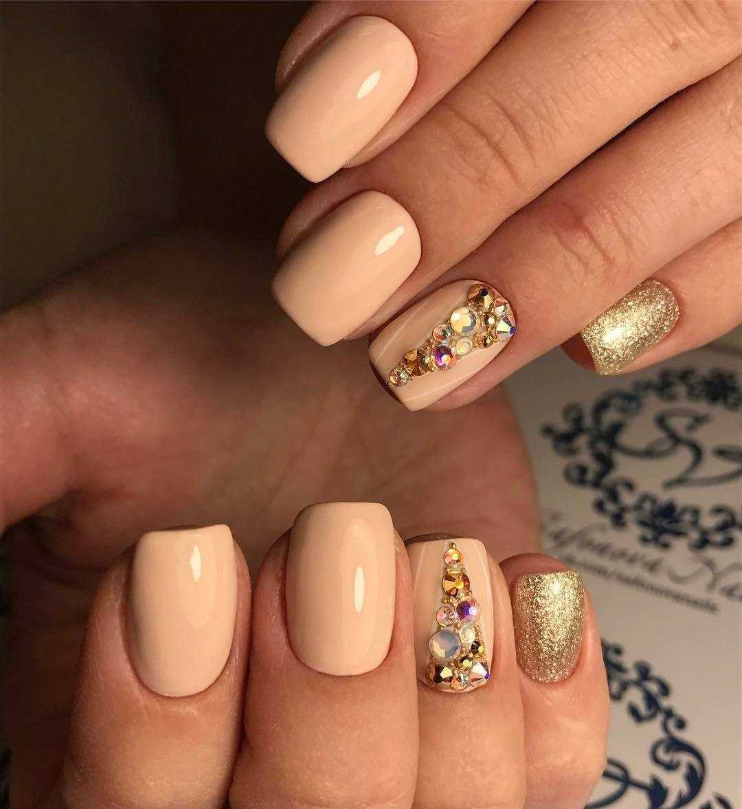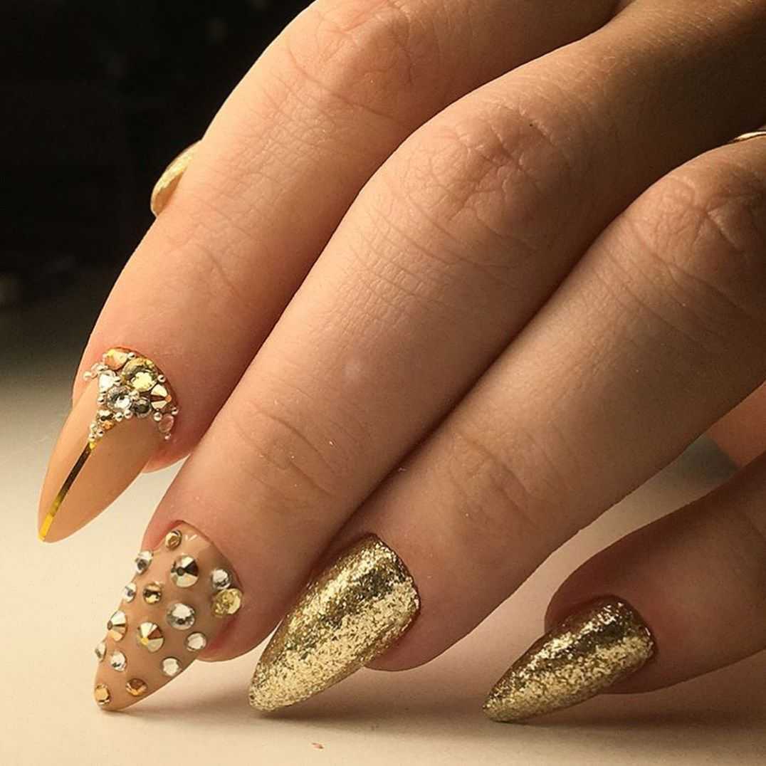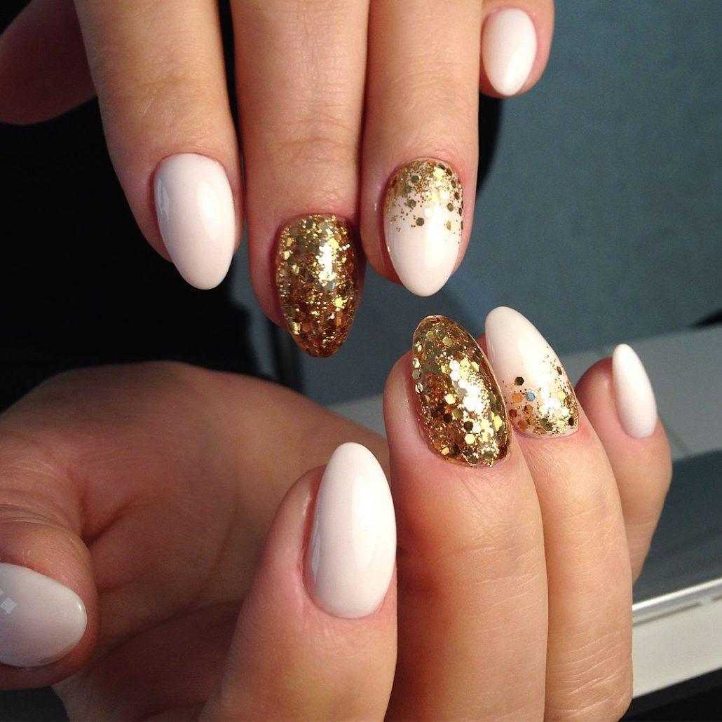 Золотой цвет можно использовать при сочетании с серым, коричневым, бордовым, черным, белым цветами. Он служит как интересное дополнение, акцент всего маникюра, а не как его основной оттенок.