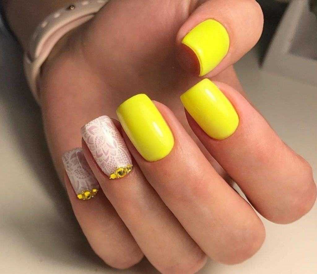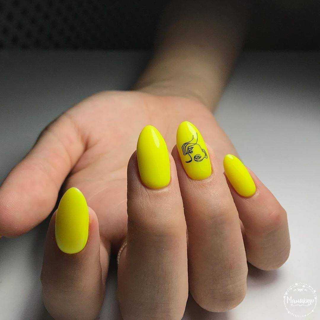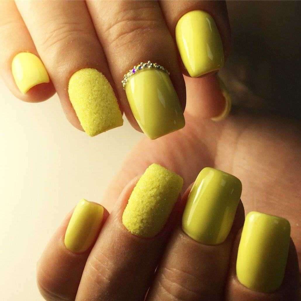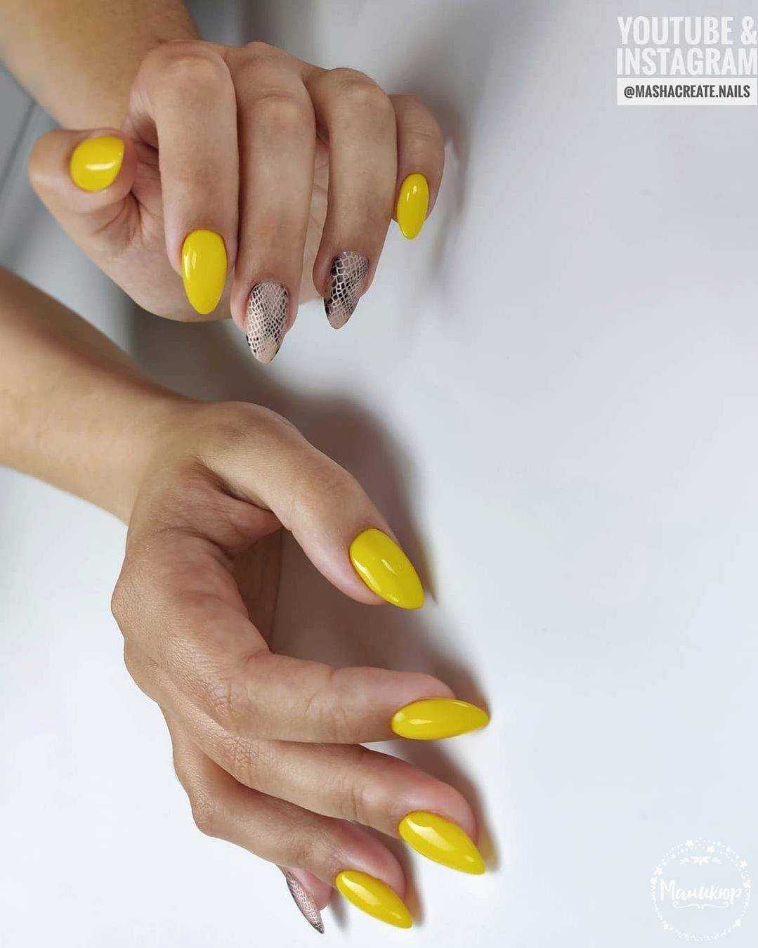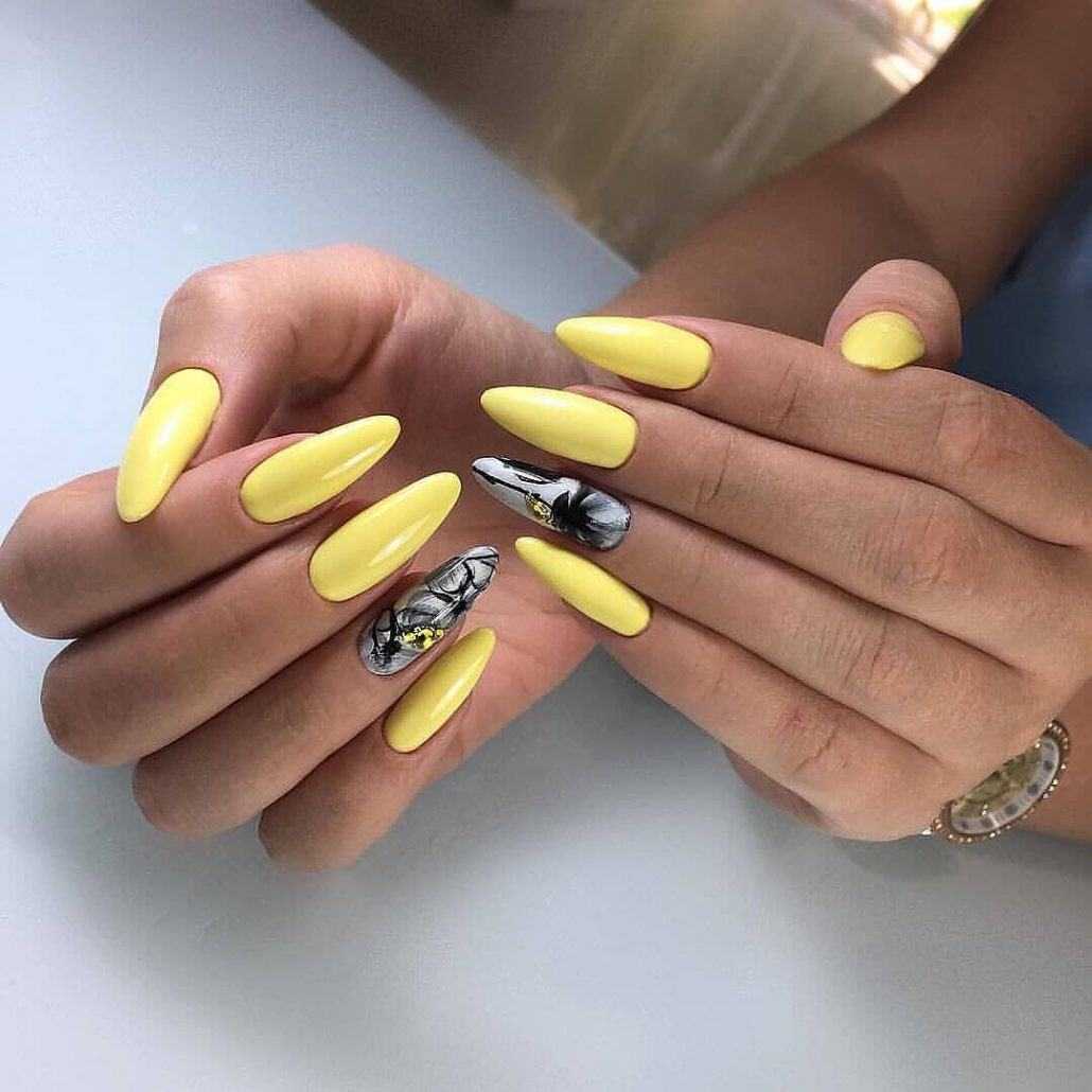 Насыщенный оттенок является самым популярным выбором в летнее время. Он идеально сочетается с короткими ноготочками любых форм. В комбинации с мягким квадратом или миндалем желтый не отвлекает внимания от образа обладательницы.