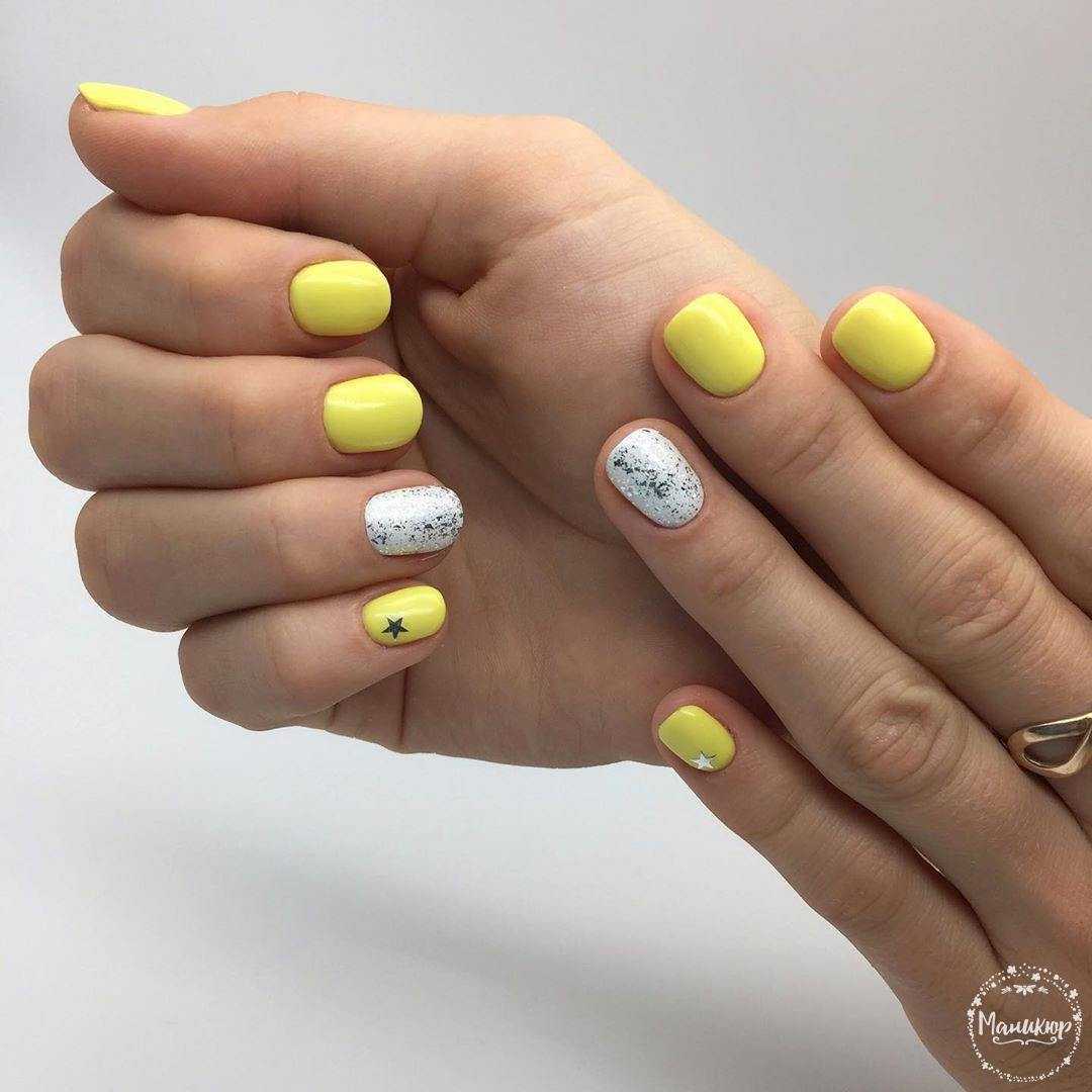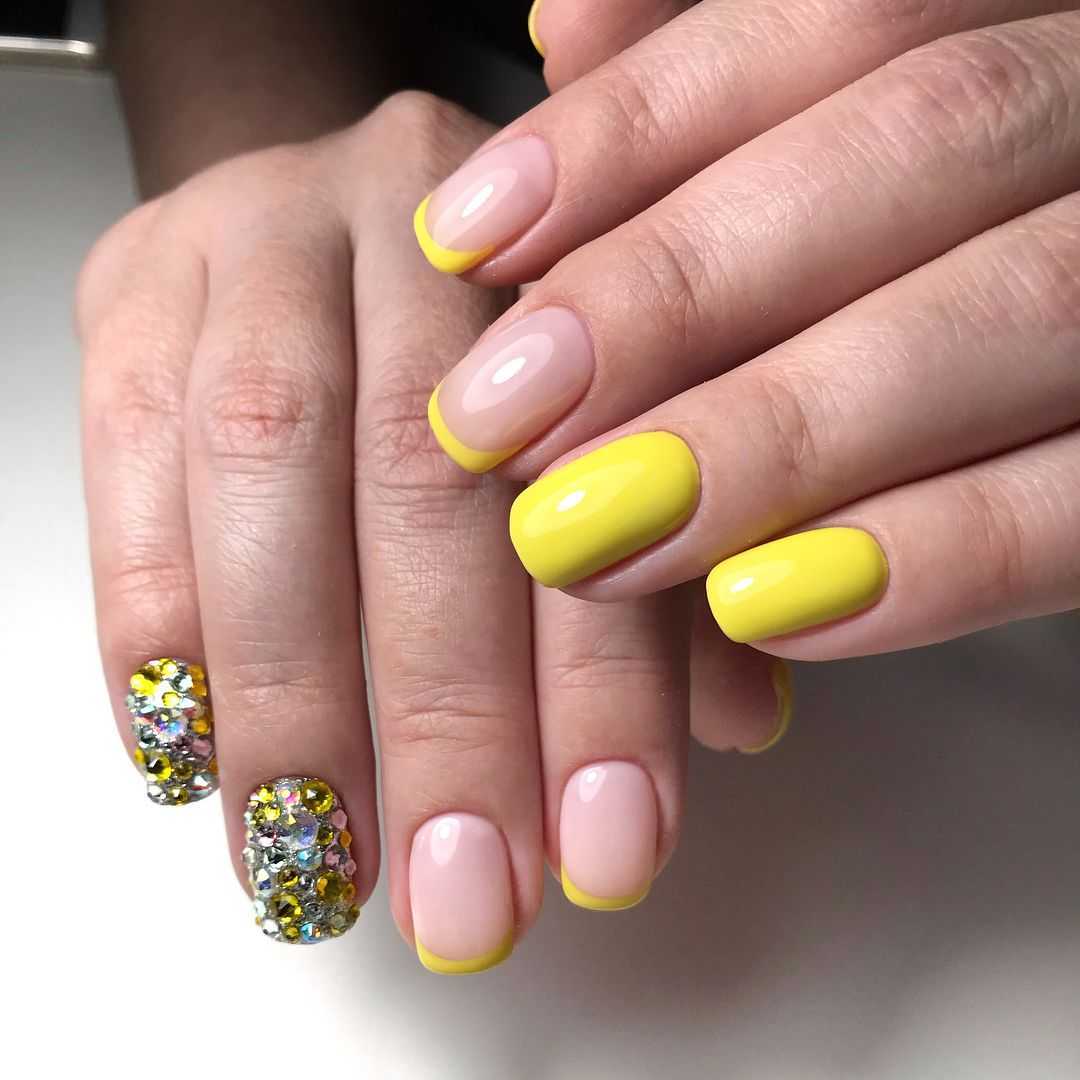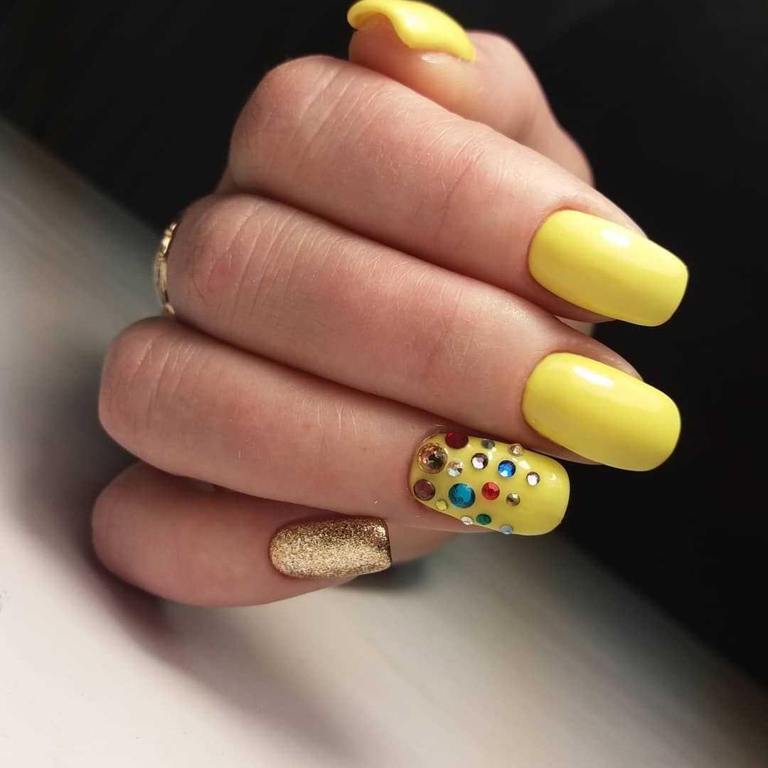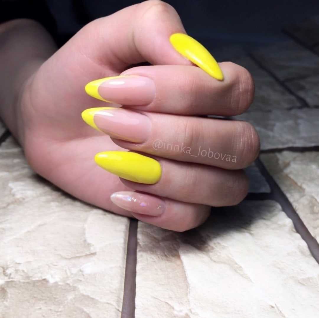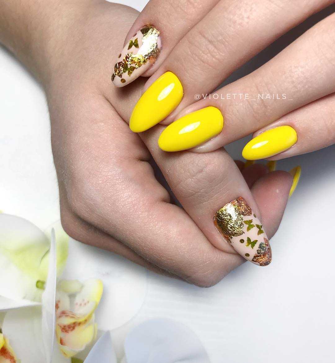 Насыщенный оттенок является самым популярным выбором в летнее время. Он идеально сочетается с короткими ноготочками любых форм. В комбинации с мягким квадратом или миндалем желтый не отвлекает внимания от образа обладательницы.