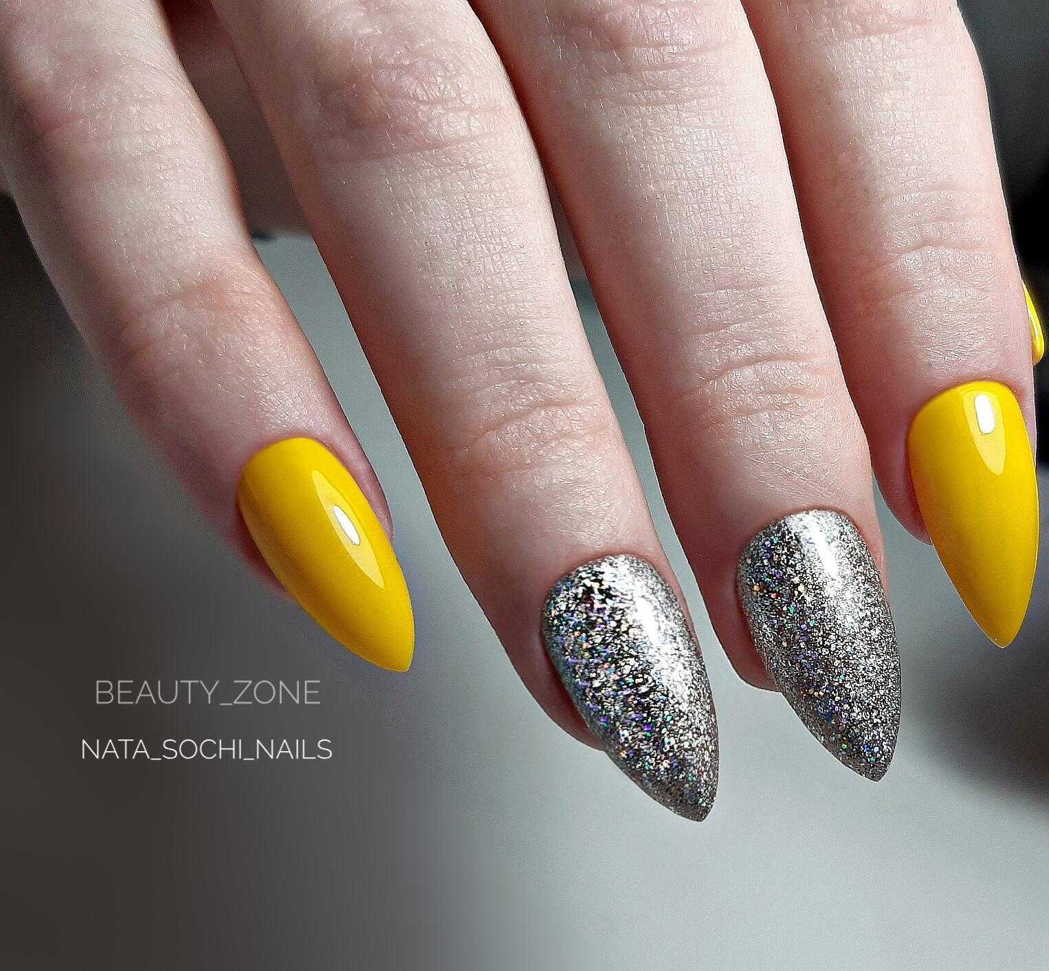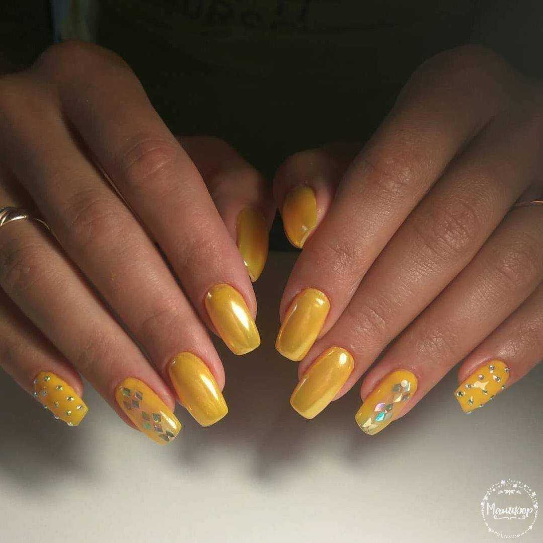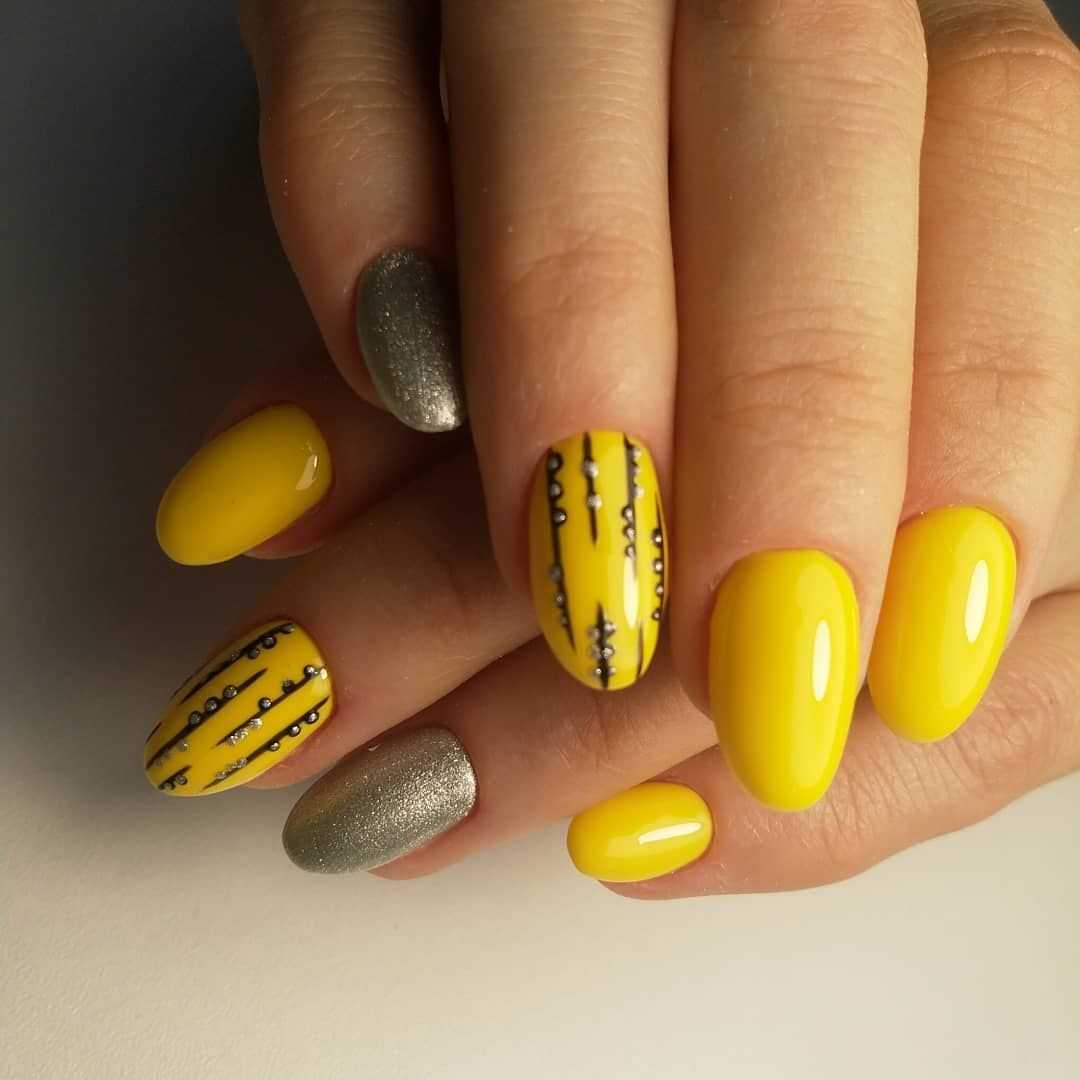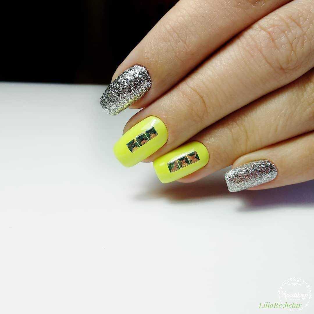 Фольга, втирка, блестящие частички глиттера или стразы способны освежить любое покрытие и уже давно считаются лучшей составляющей стильных нейл-артов. Дизайн, выполненный в жёлтых тонах, с серебристыми или золотистыми акцентами станет прекрасной идеи для маникюра на каждый день и не только. При помощи страз можно красиво украсит основание ноготка или преобразить рисунок. Блестящие штрихи глиттера чудесно прорисовывают мелкие детали. Переливы втирки подарят ноготкам волшебное сияние. Фольга позволит украсить покрытие оригинальным узором. Вариаций – множество.