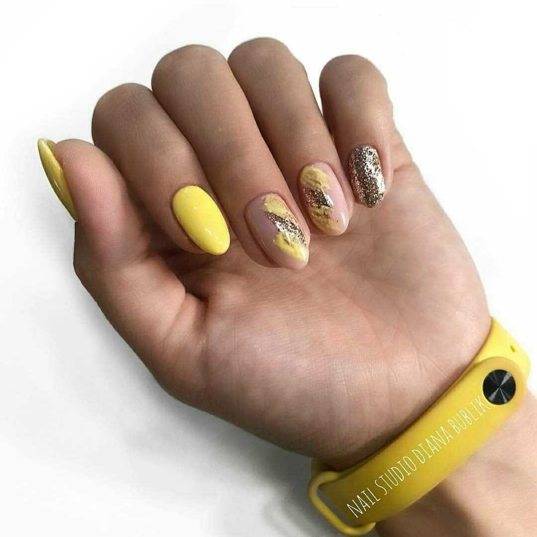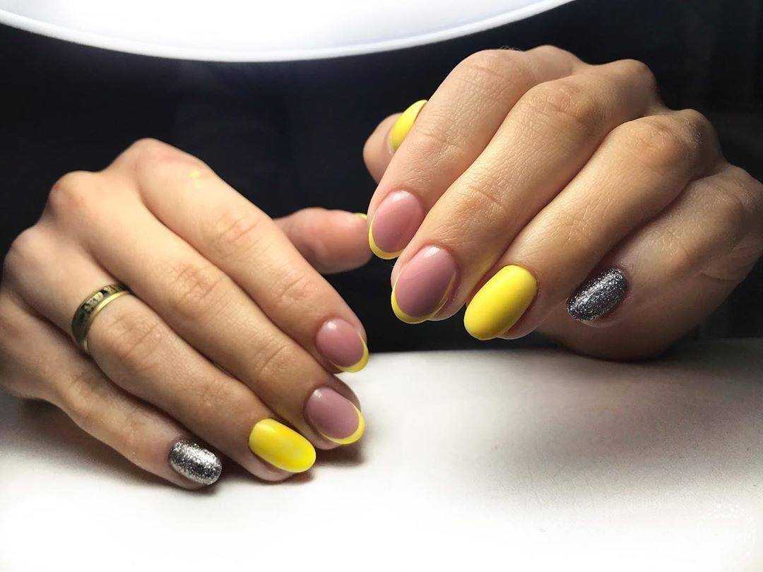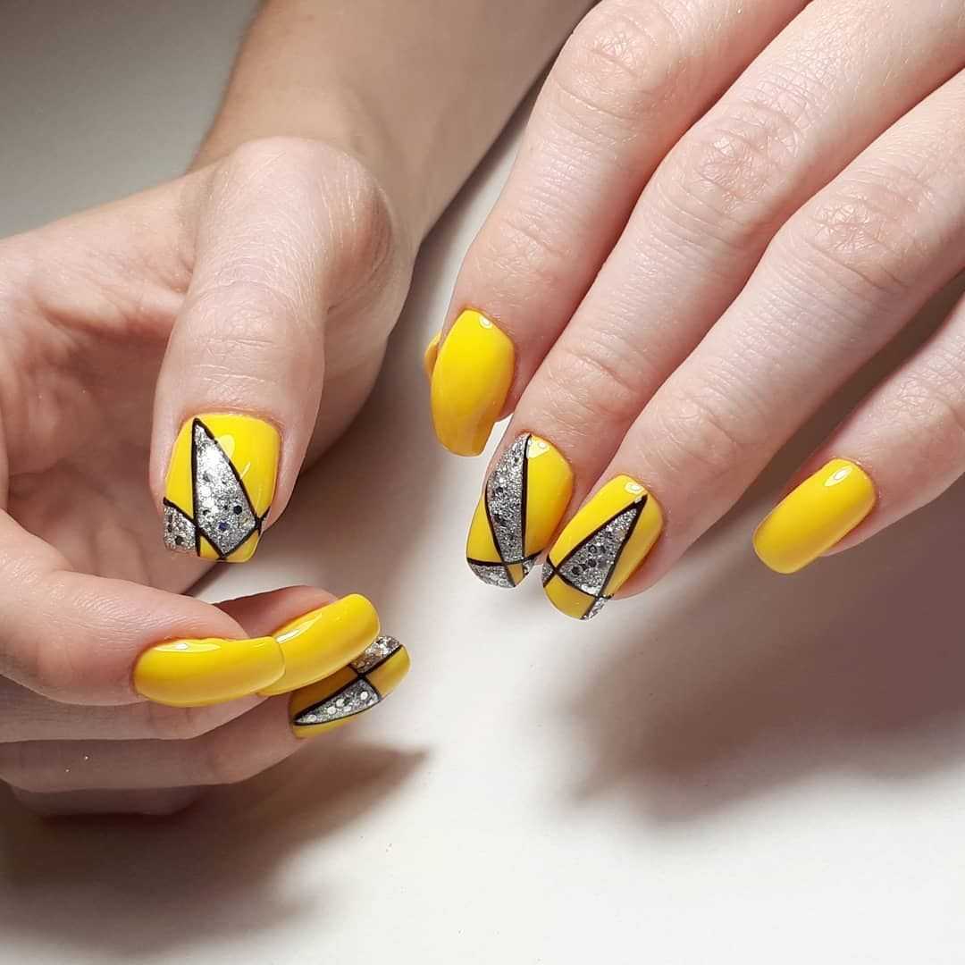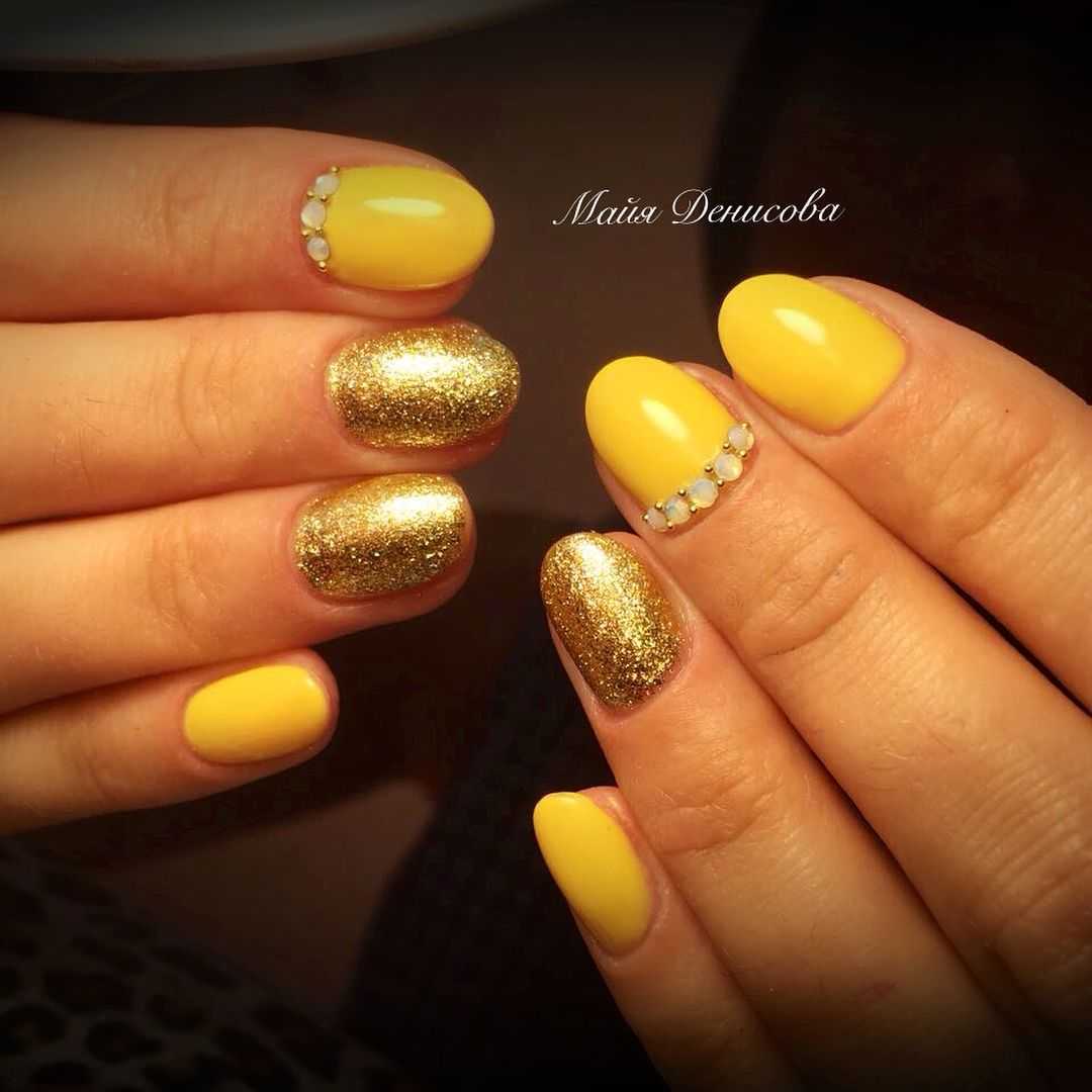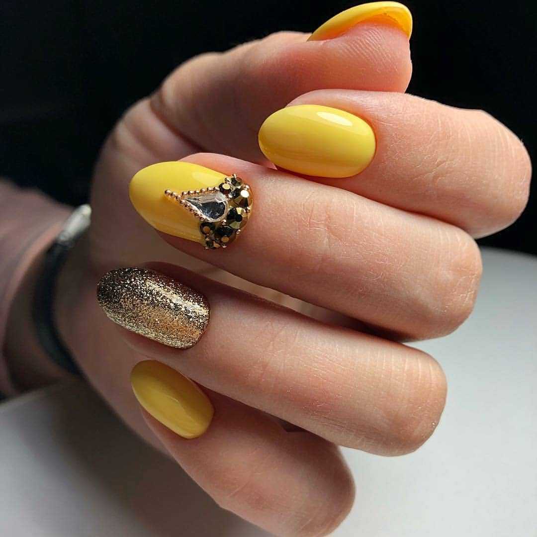 Фольга, втирка, блестящие частички глиттера или стразы способны освежить любое покрытие и уже давно считаются лучшей составляющей стильных нейл-артов. Дизайн, выполненный в жёлтых тонах, с серебристыми или золотистыми акцентами станет прекрасной идеи для маникюра на каждый день и не только. При помощи страз можно красиво украсит основание ноготка или преобразить рисунок. Блестящие штрихи глиттера чудесно прорисовывают мелкие детали. Переливы втирки подарят ноготкам волшебное сияние. Фольга позволит украсить покрытие оригинальным узором. Вариаций – множество.
