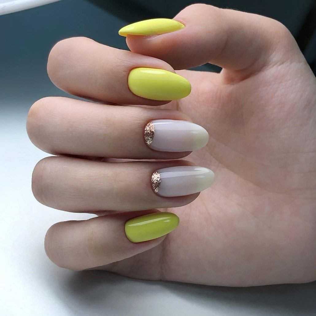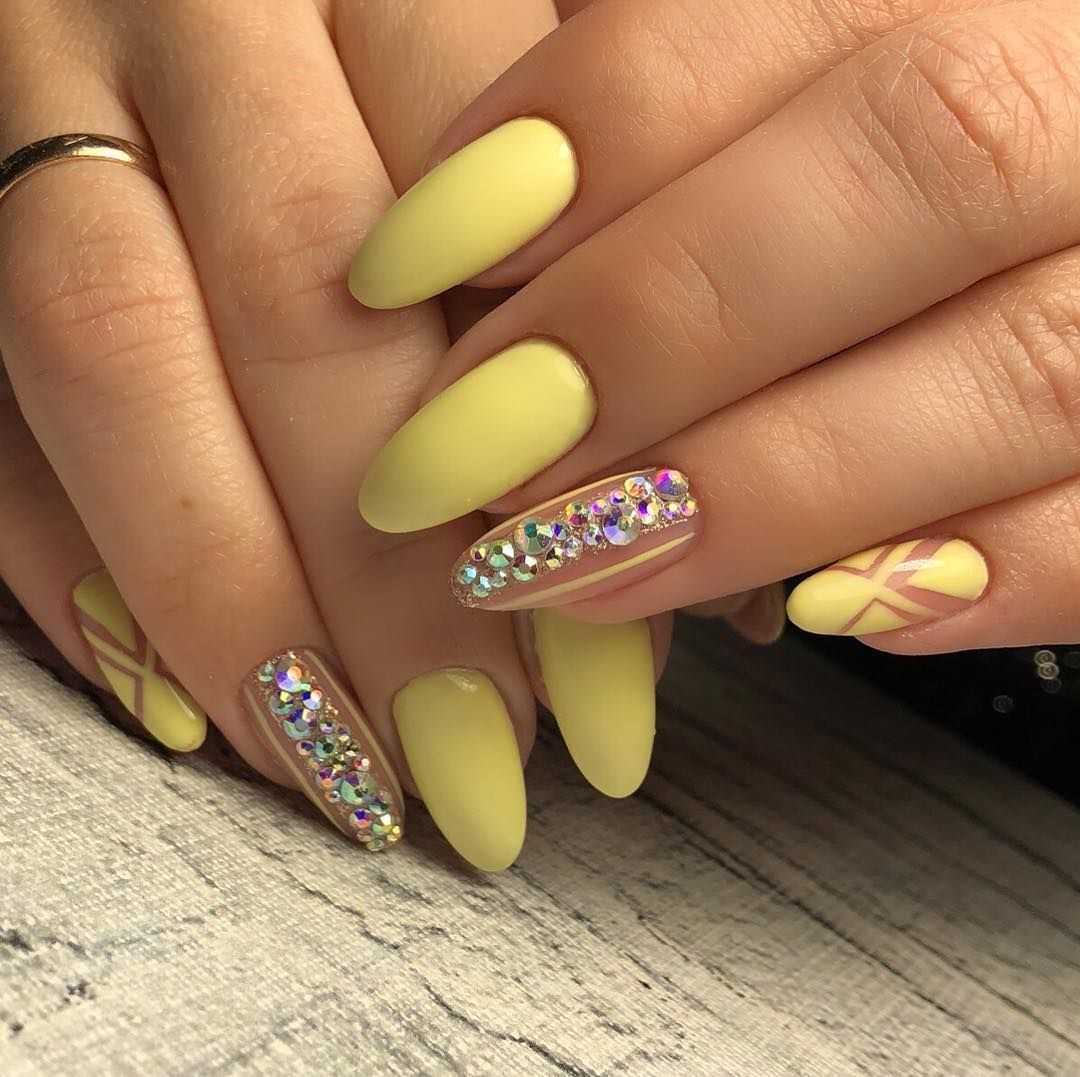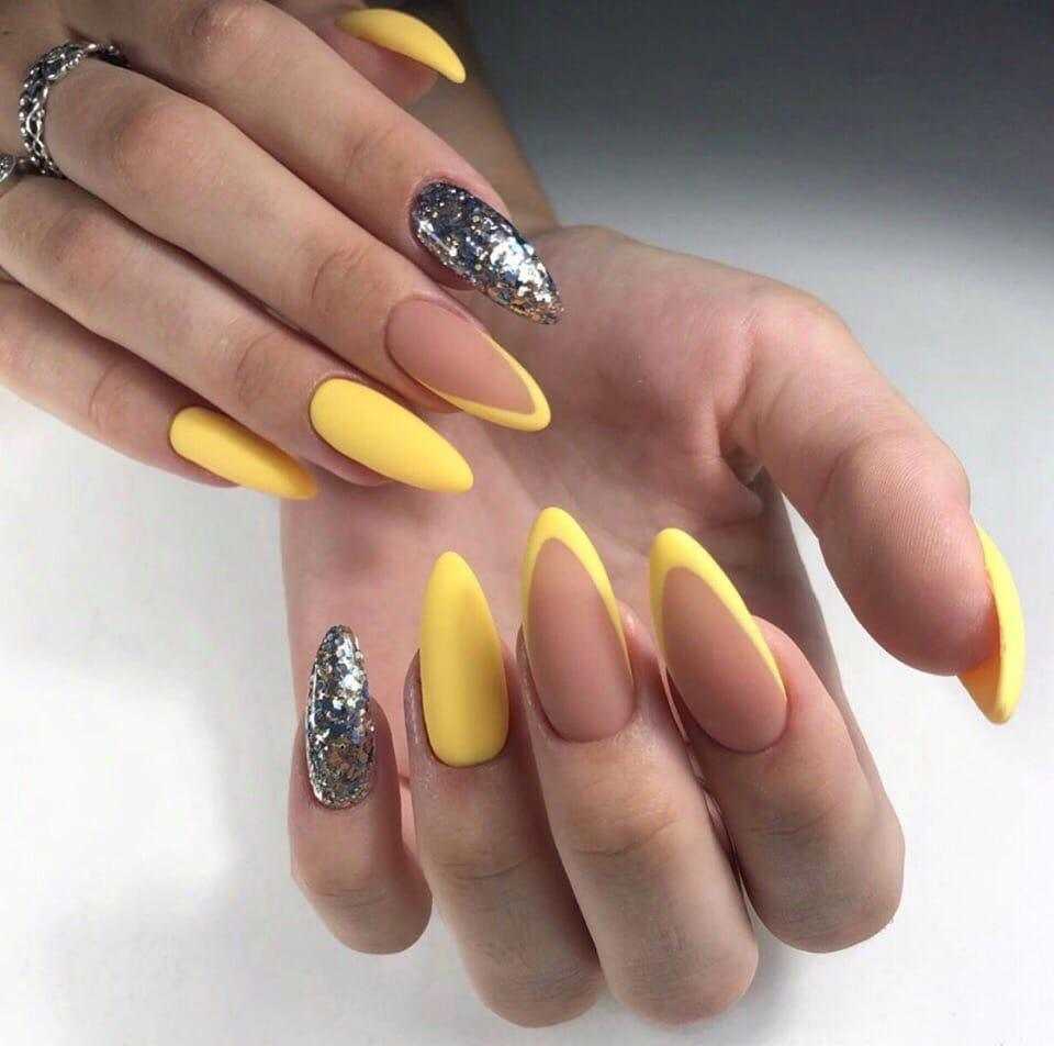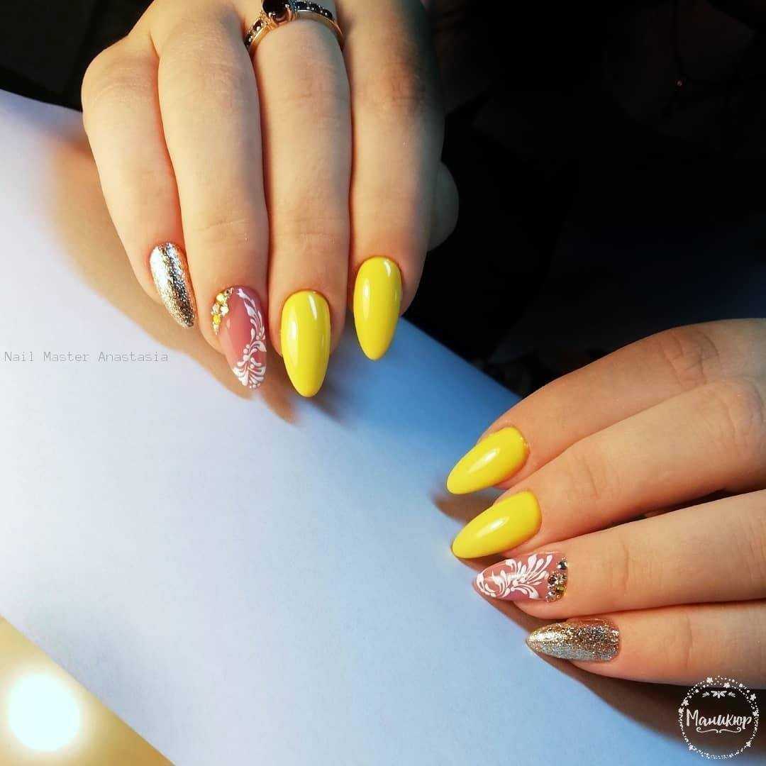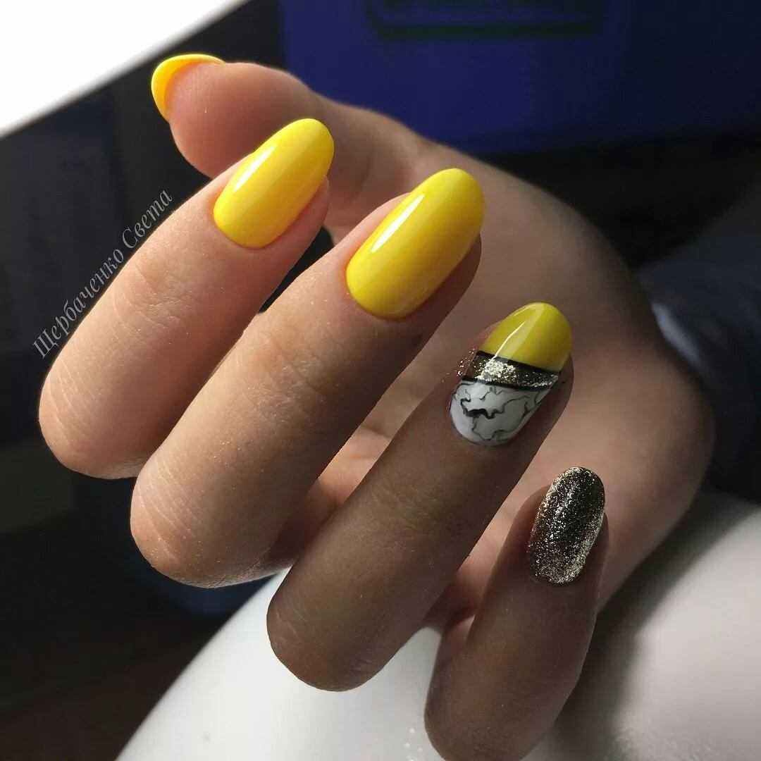 Фольга, втирка, блестящие частички глиттера или стразы способны освежить любое покрытие и уже давно считаются лучшей составляющей стильных нейл-артов. Дизайн, выполненный в жёлтых тонах, с серебристыми или золотистыми акцентами станет прекрасной идеи для маникюра на каждый день и не только. При помощи страз можно красиво украсит основание ноготка или преобразить рисунок. Блестящие штрихи глиттера чудесно прорисовывают мелкие детали. Переливы втирки подарят ноготкам волшебное сияние. Фольга позволит украсить покрытие оригинальным узором. Вариаций – множество.