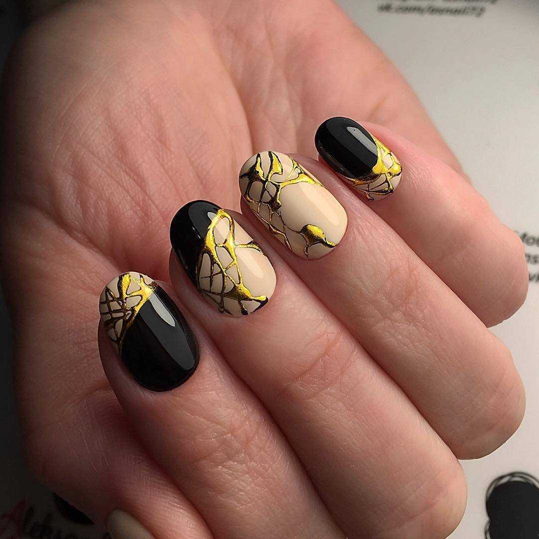 Черно-бежевый маникюр с объемным пауком и черным кружевом: