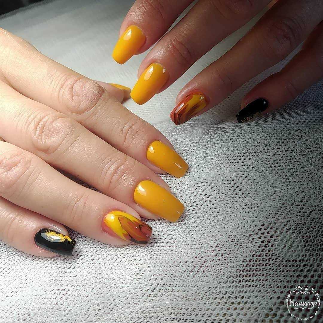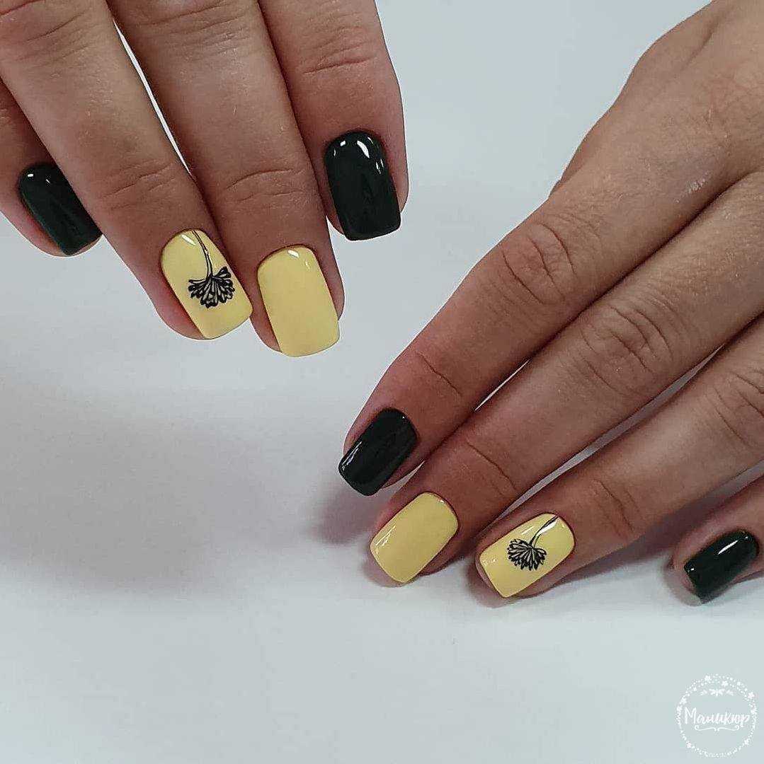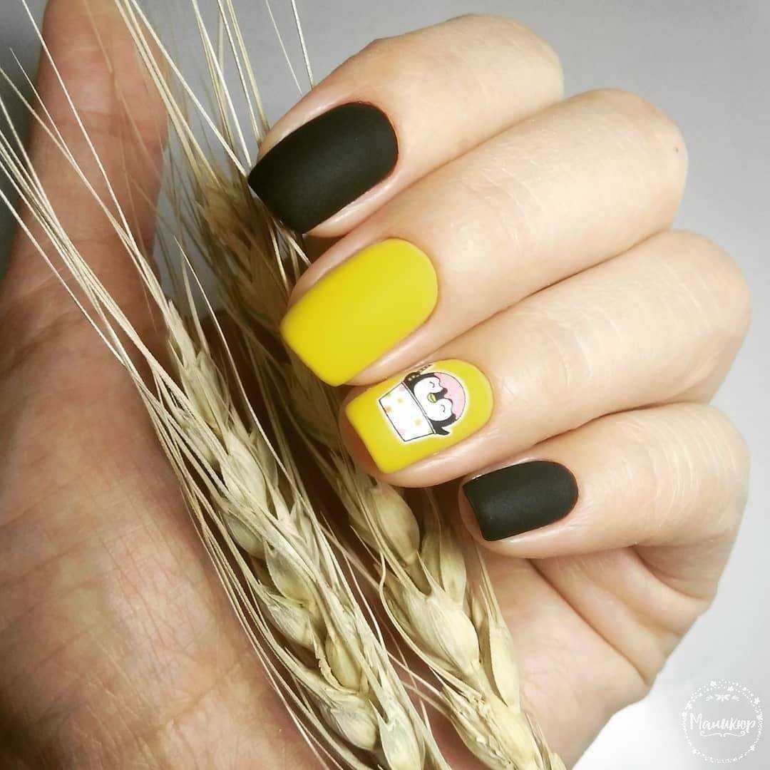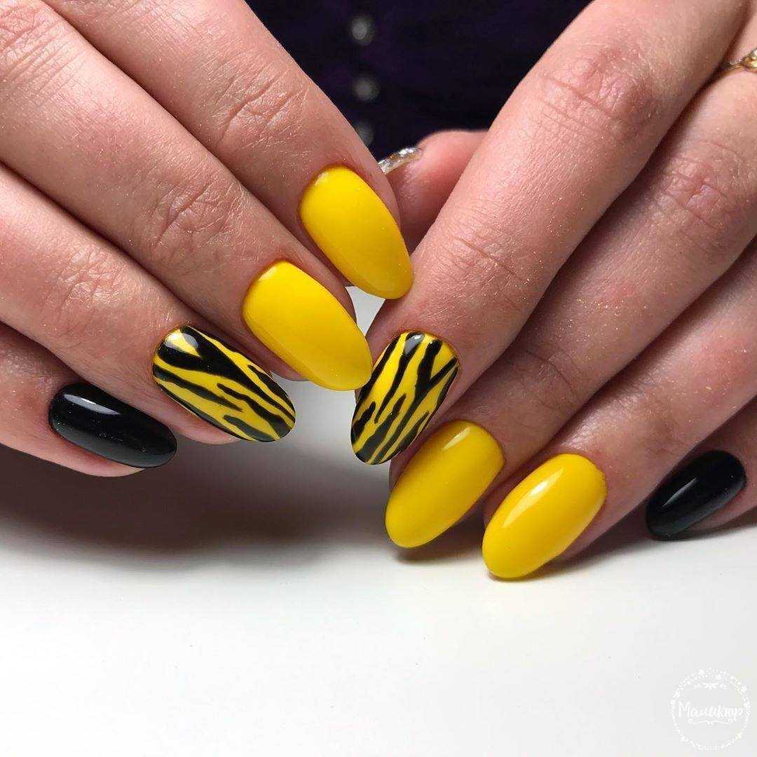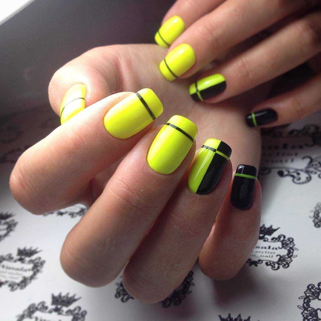 На ногтях квадратной формы и средней длины хорошо смотрится черно-желтый маникюр, где основа окрашена в желтый цвет, а вдоль ногтя прорисованы черные точки, цветные рисунки или полоски.