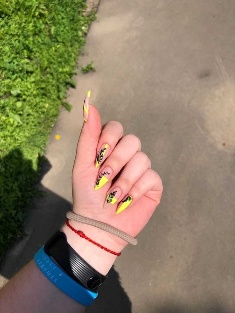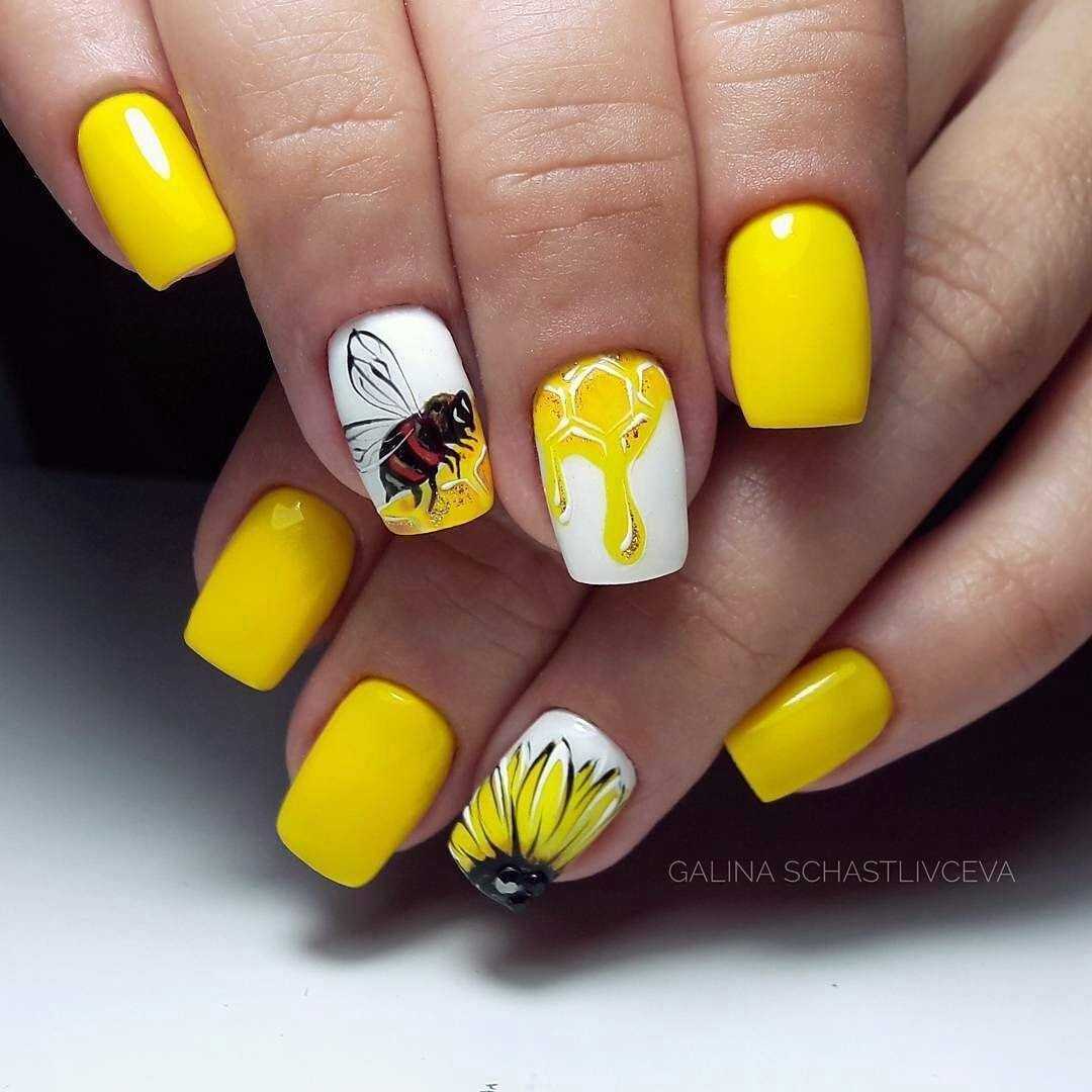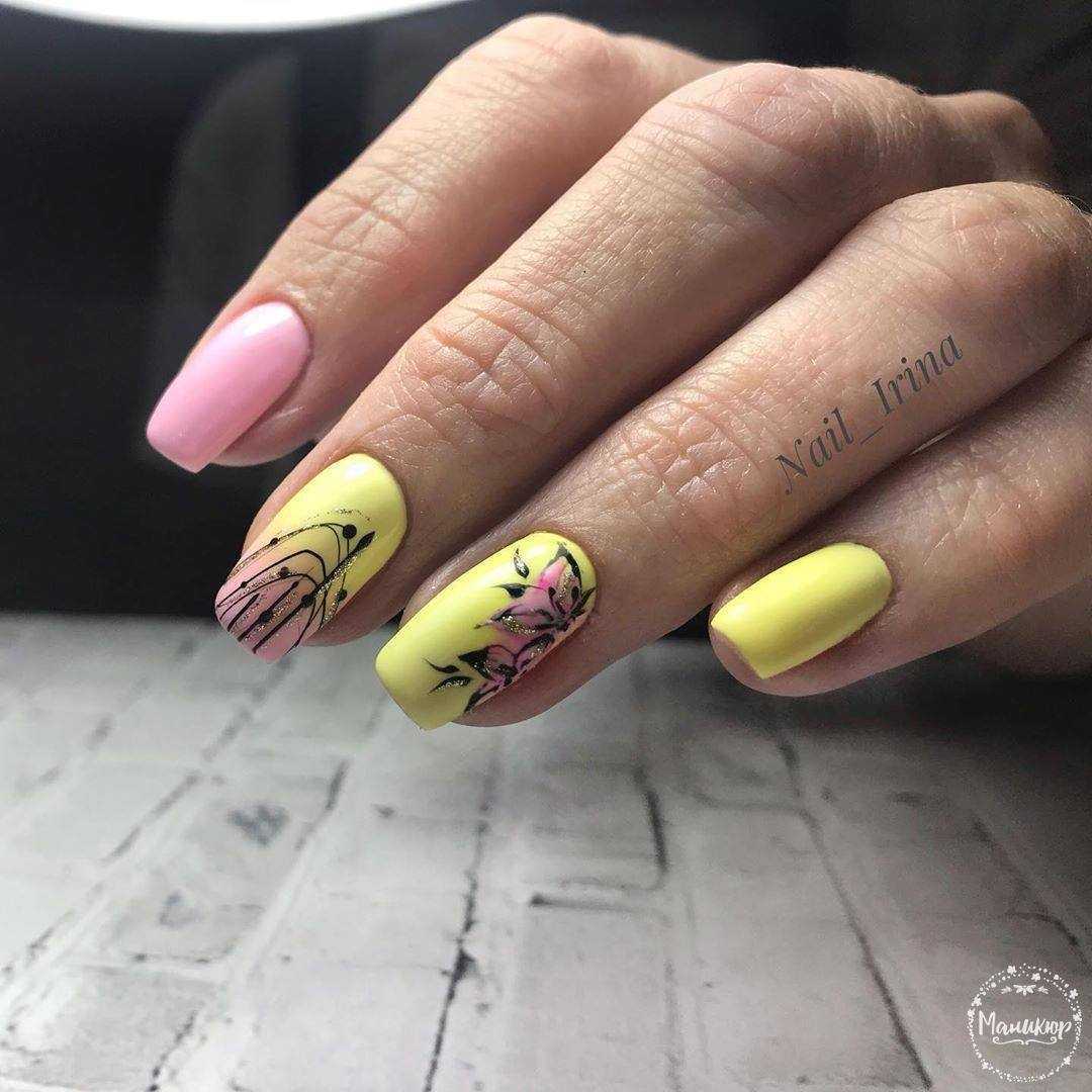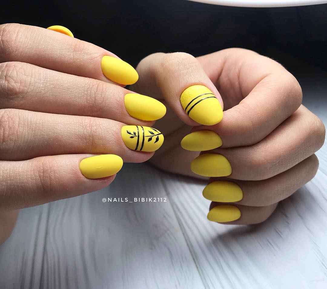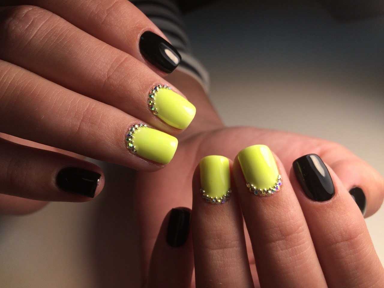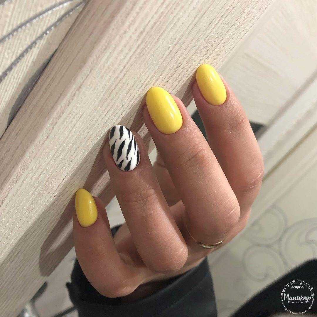 На ногтях квадратной формы и средней длины хорошо смотрится черно-желтый маникюр, где основа окрашена в желтый цвет, а вдоль ногтя прорисованы черные точки, цветные рисунки или полоски.