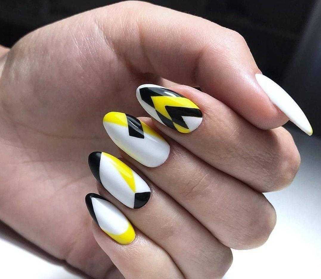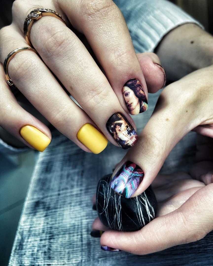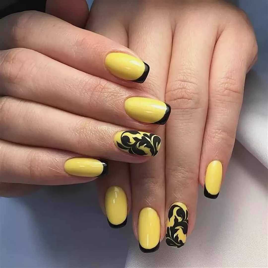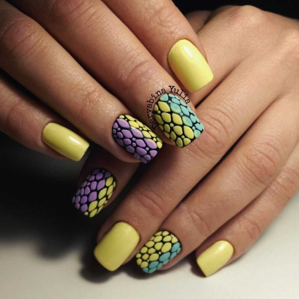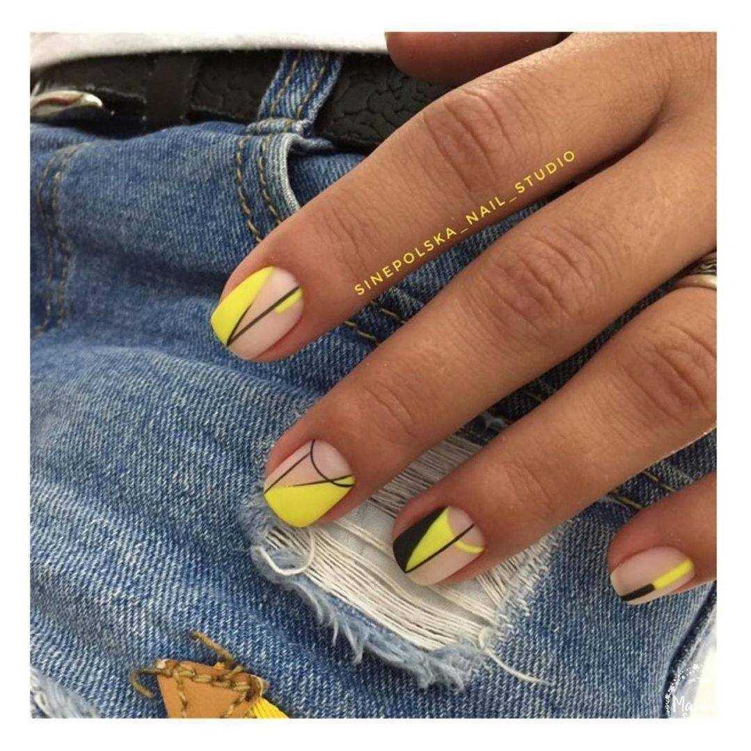 На ногтях квадратной формы и средней длины хорошо смотрится черно-желтый маникюр, где основа окрашена в желтый цвет, а вдоль ногтя прорисованы черные точки, цветные рисунки или полоски.