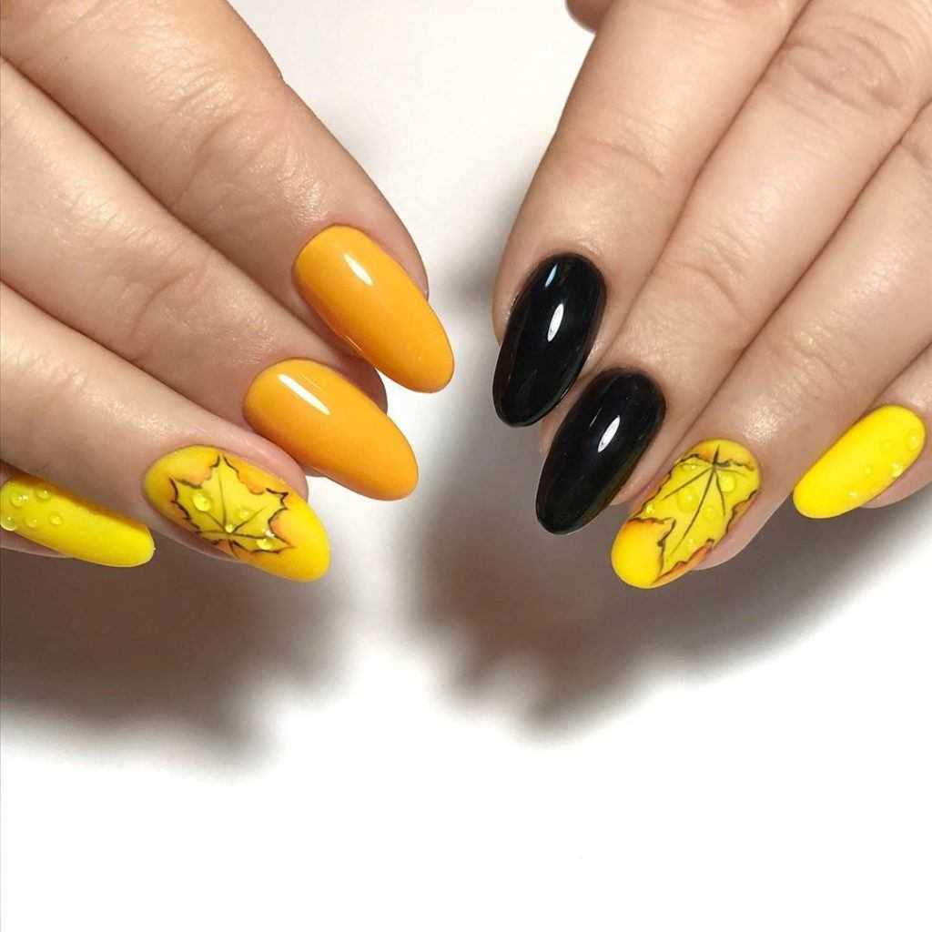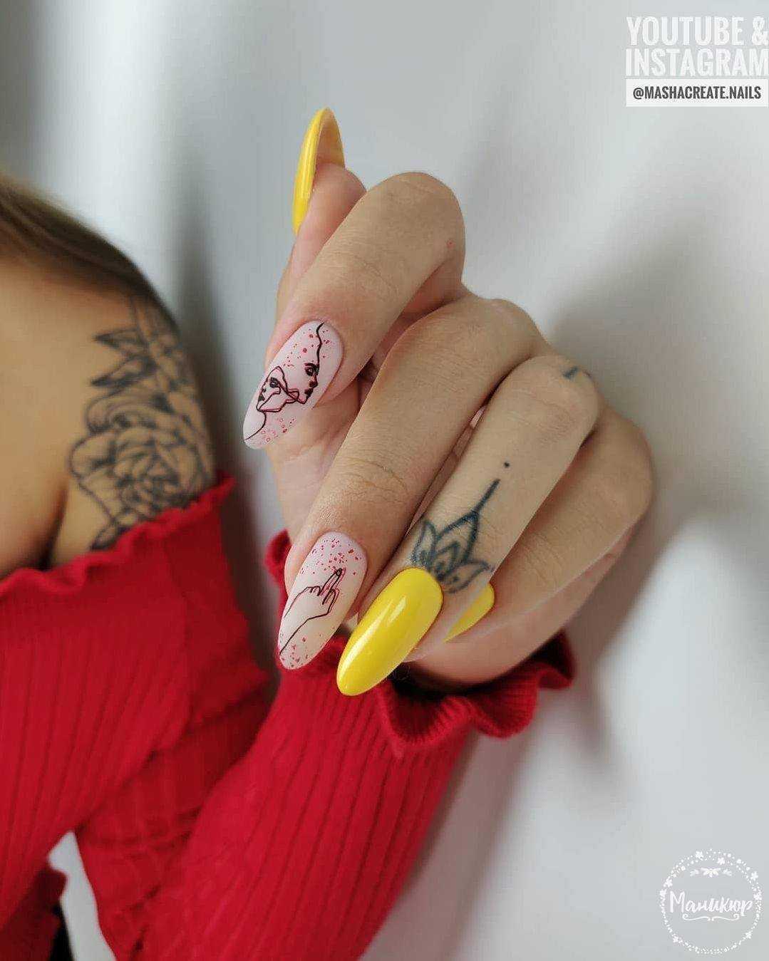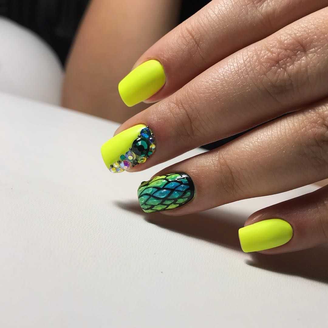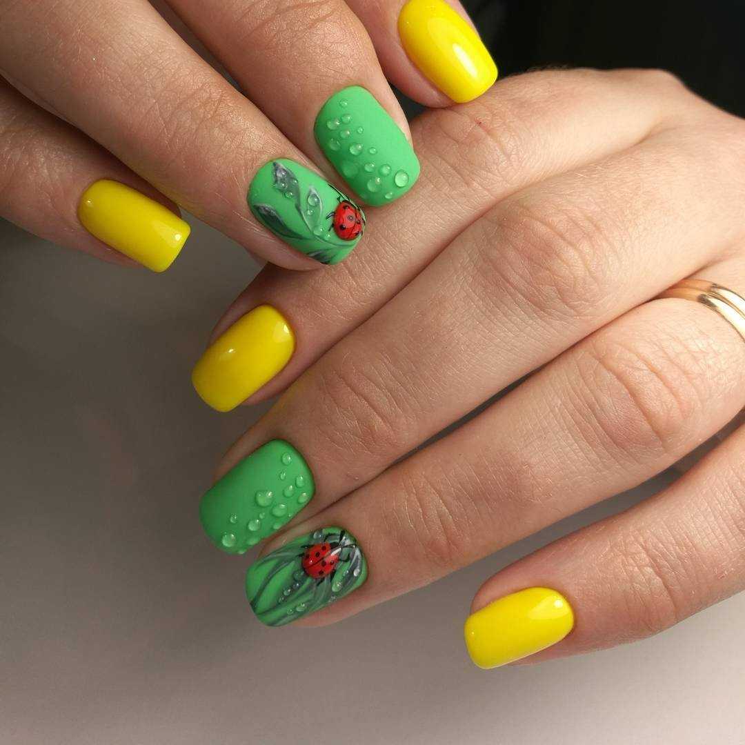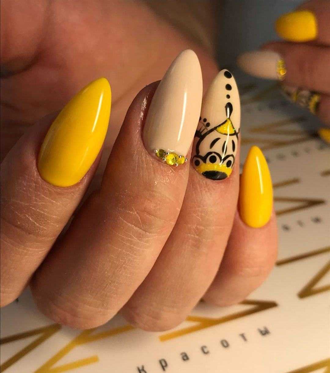На ногтях квадратной формы и средней длины хорошо смотрится черно-желтый маникюр, где основа окрашена в желтый цвет, а вдоль ногтя прорисованы черные точки, цветные рисунки или полоски.