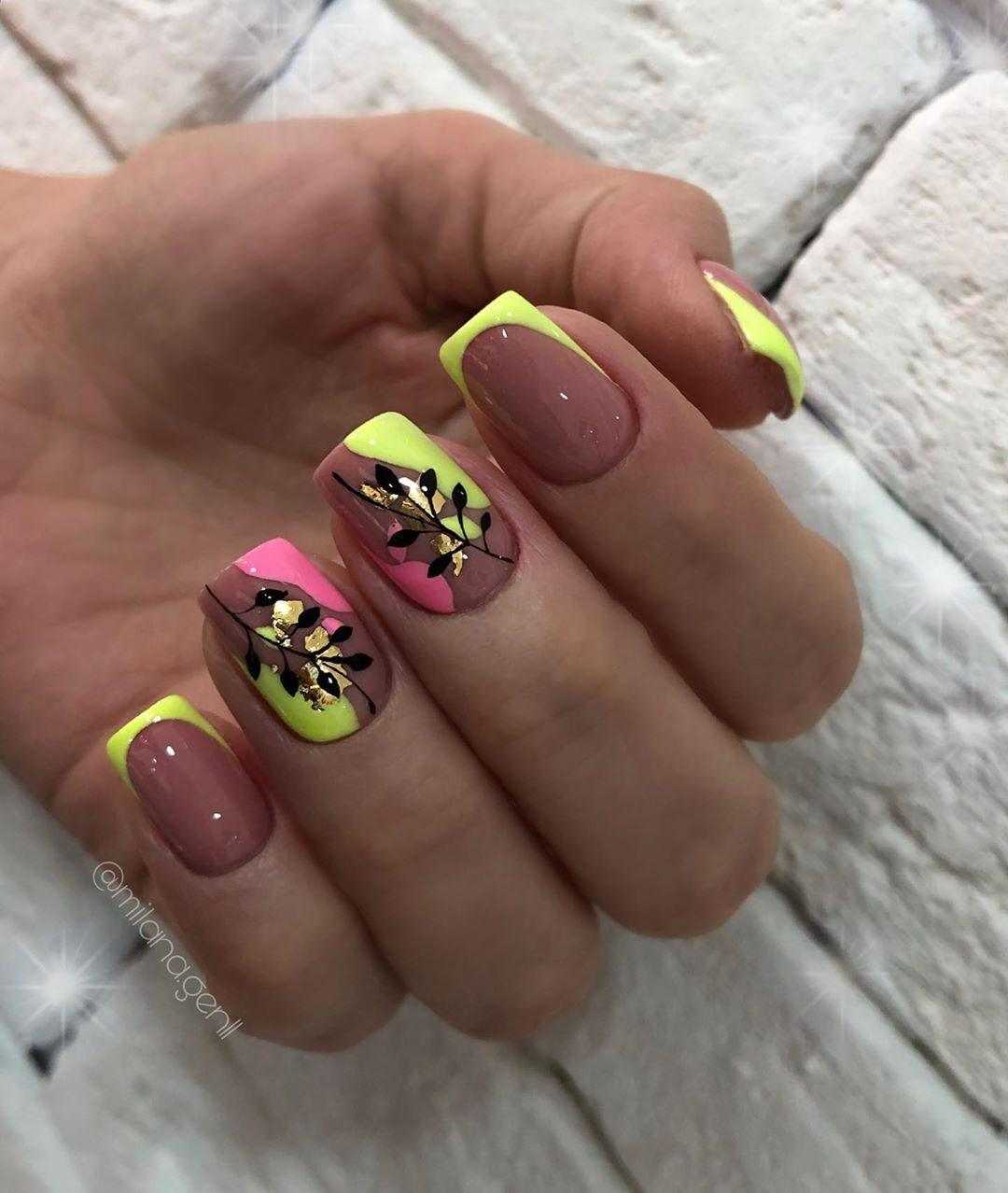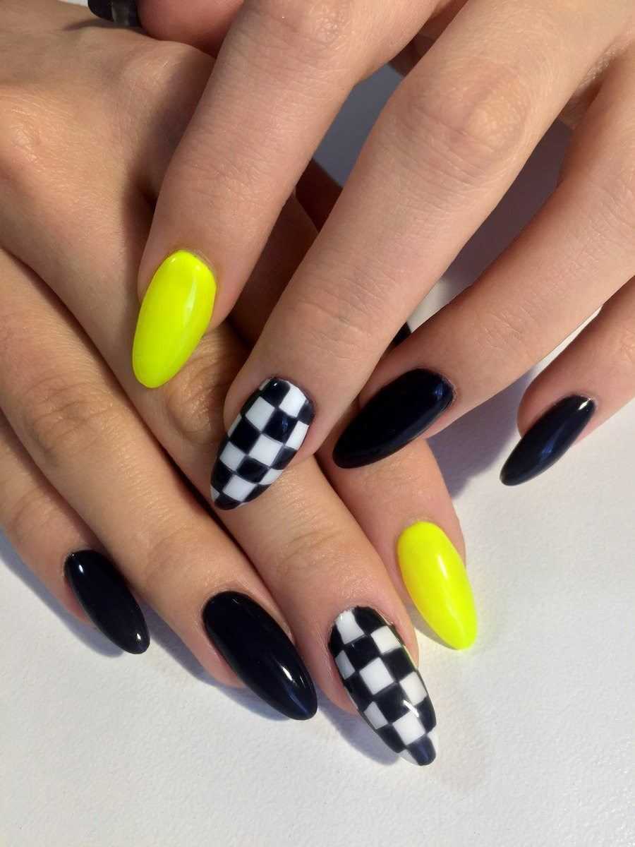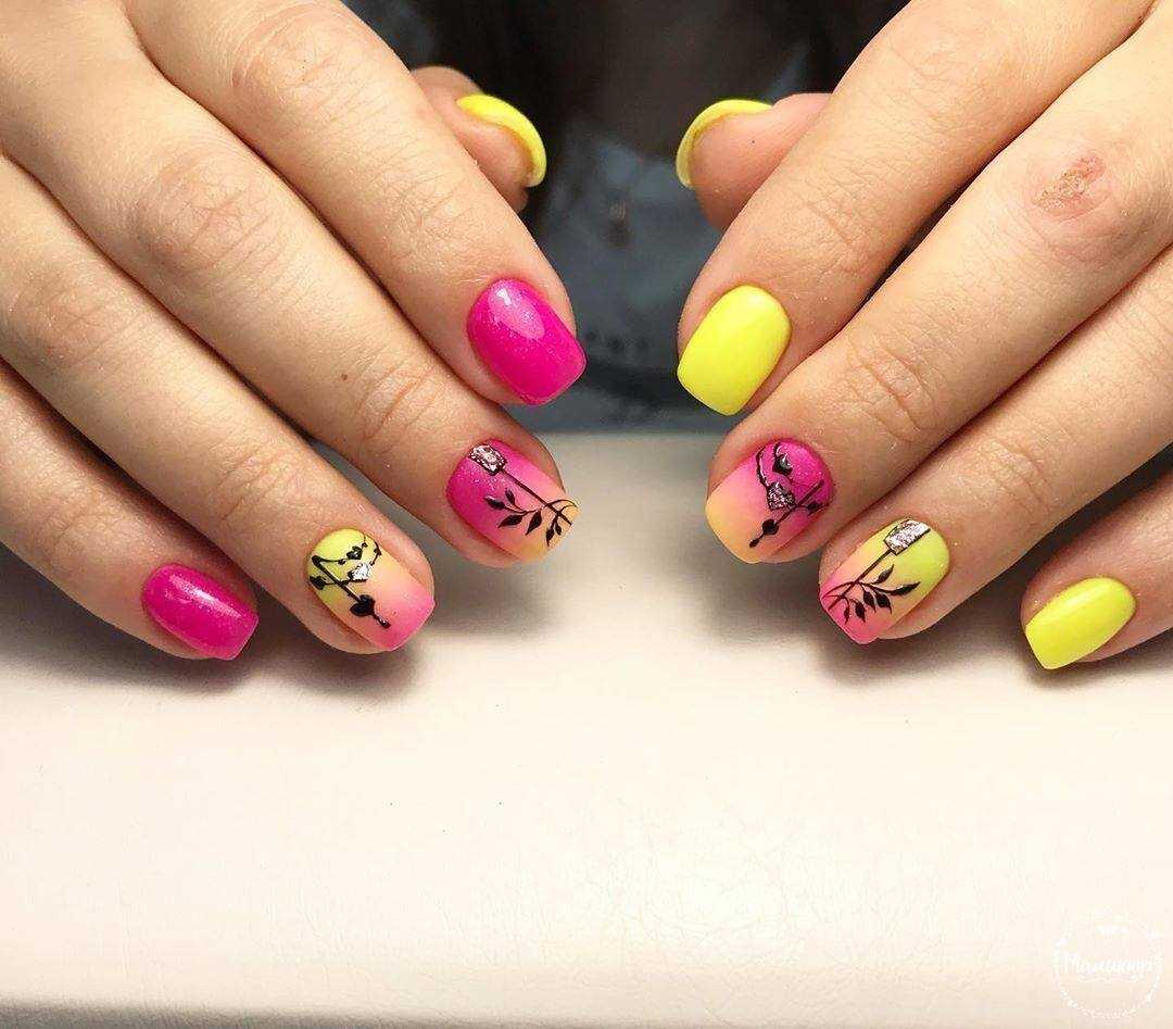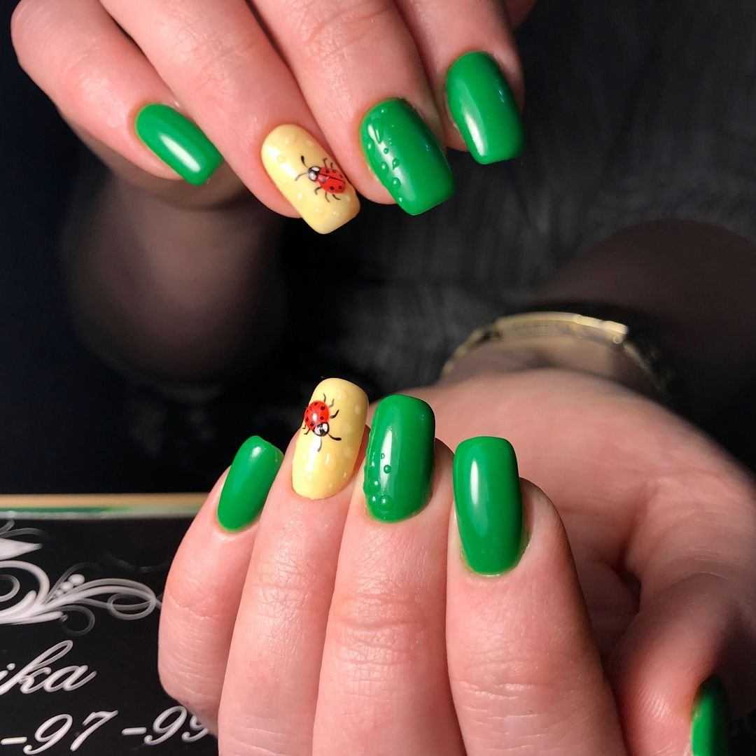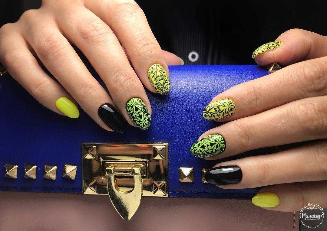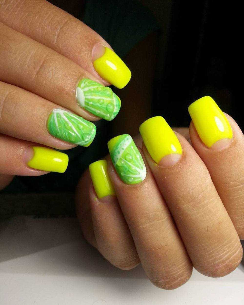 На ногтях квадратной формы и средней длины хорошо смотрится черно-желтый маникюр, где основа окрашена в желтый цвет, а вдоль ногтя прорисованы черные точки, цветные рисунки или полоски.