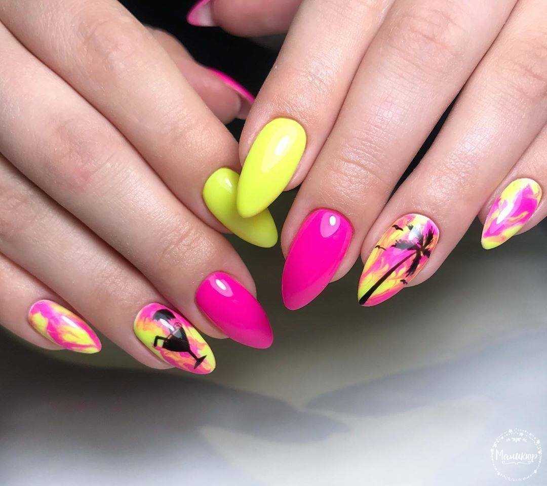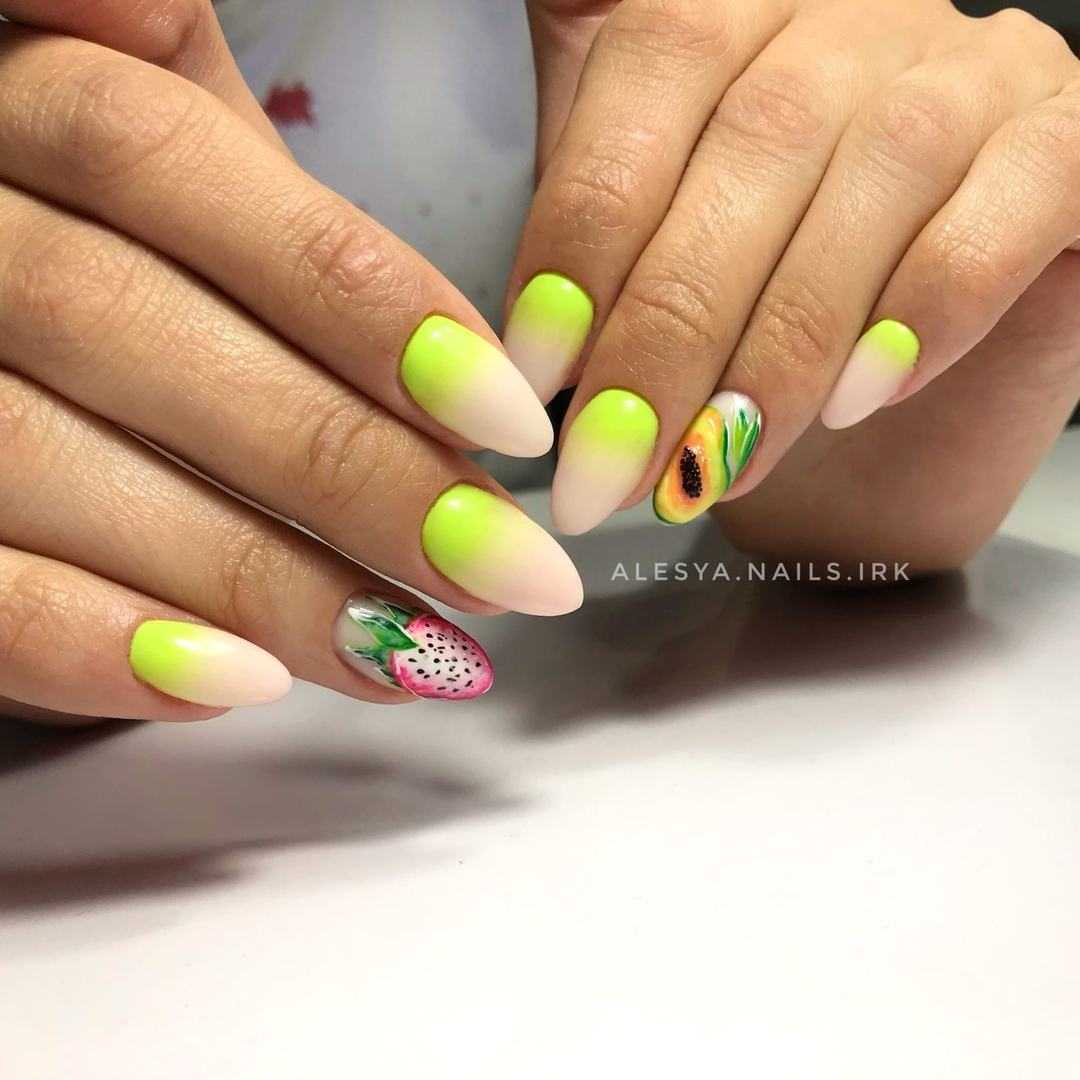 Интересным решением станет и френч с желтым лаком или блестками по краешку ногтевой пластины. Изысканно на длинных ногтях будет выглядеть рисунок с крупными цветами или любыми другими предметами, такими как любимые всеми авокадо, ананасы, радужные пони, сердечки, смайлики.