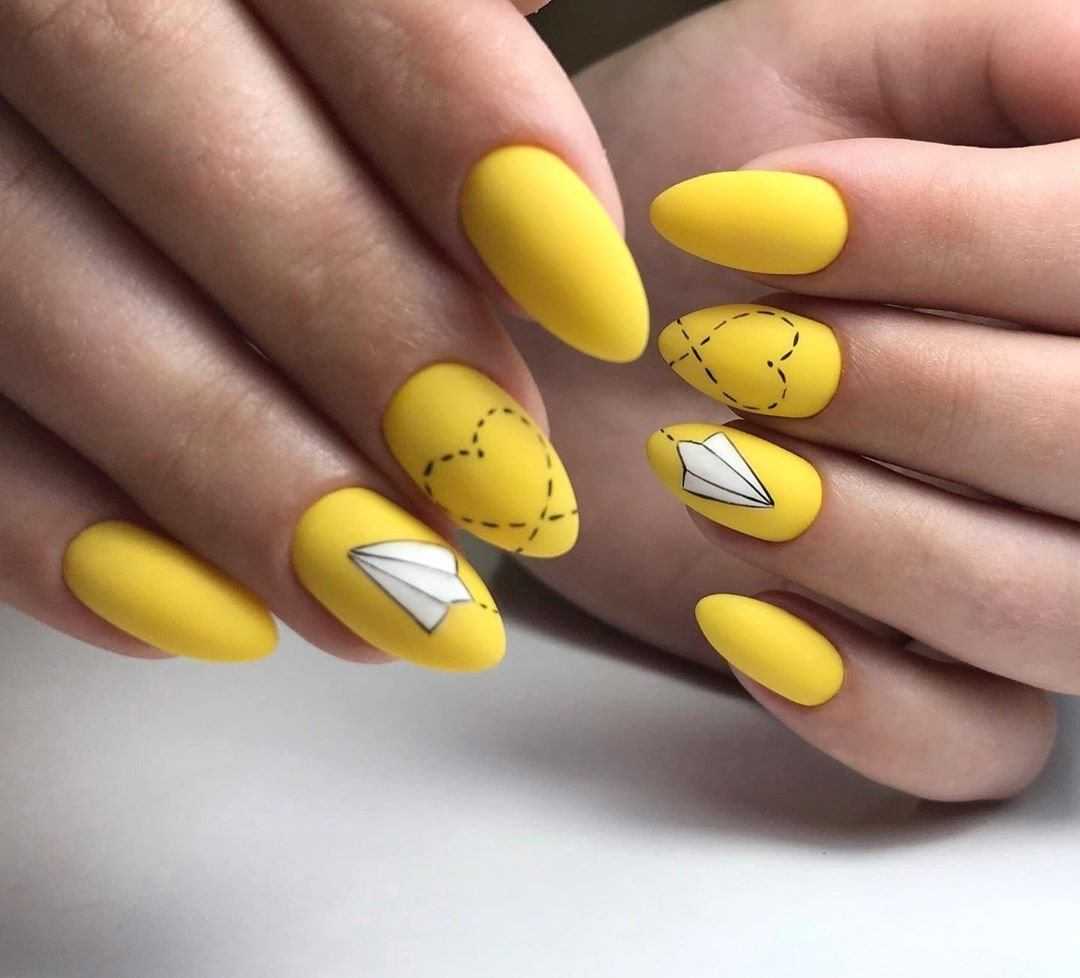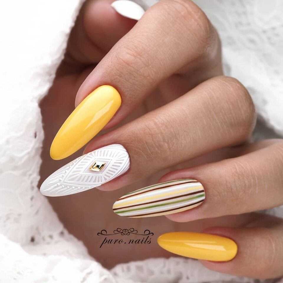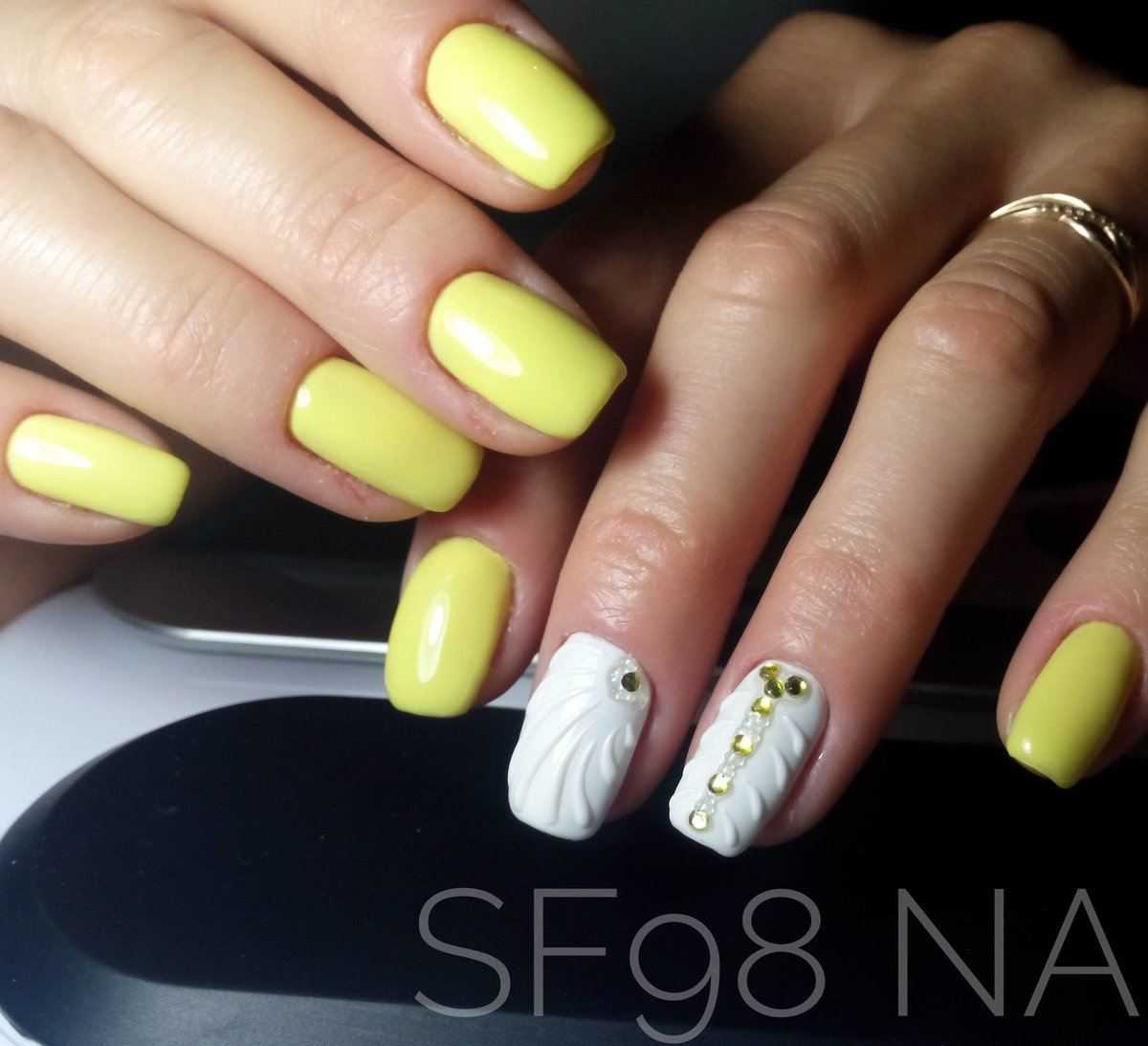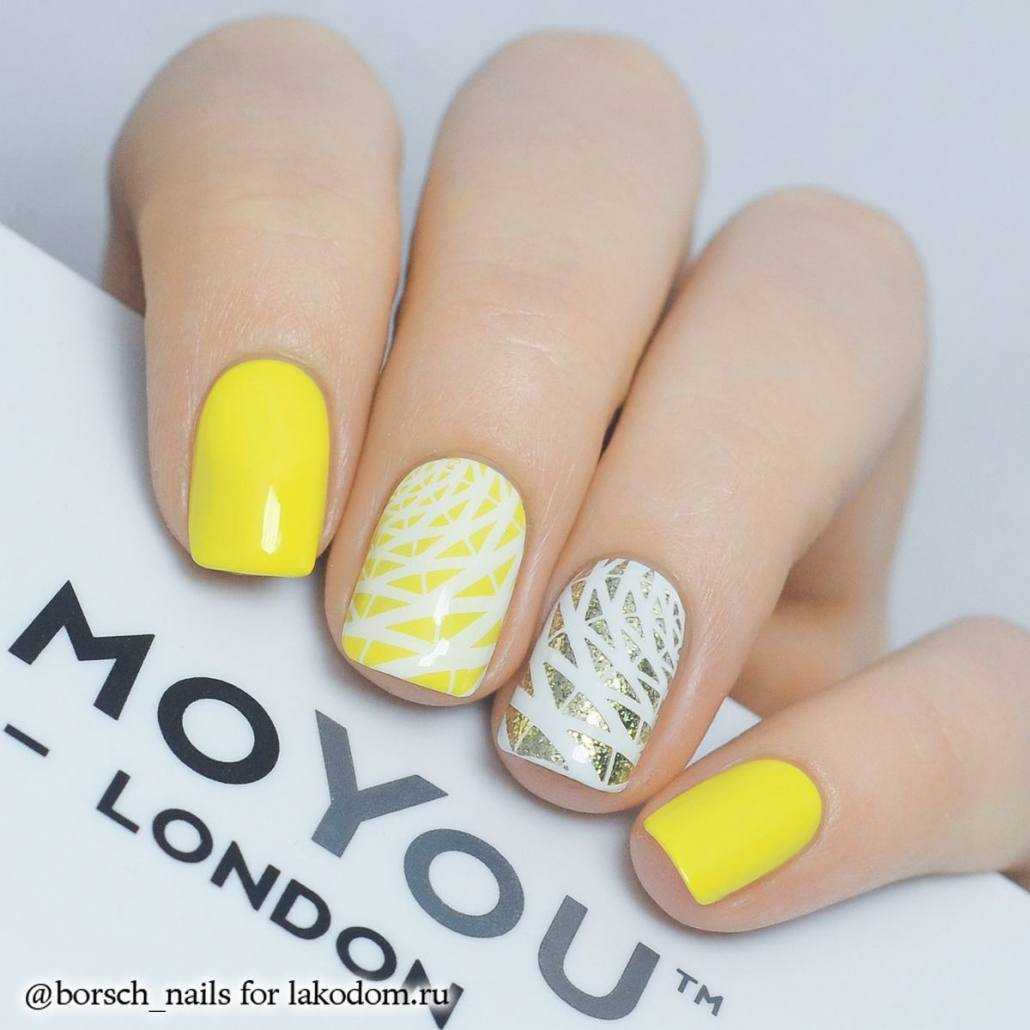 Белый цвет в виде стемпинга, оригами или паутинки оттеняет яркость желтого цвета и делает маникюр мягкими и нежным.