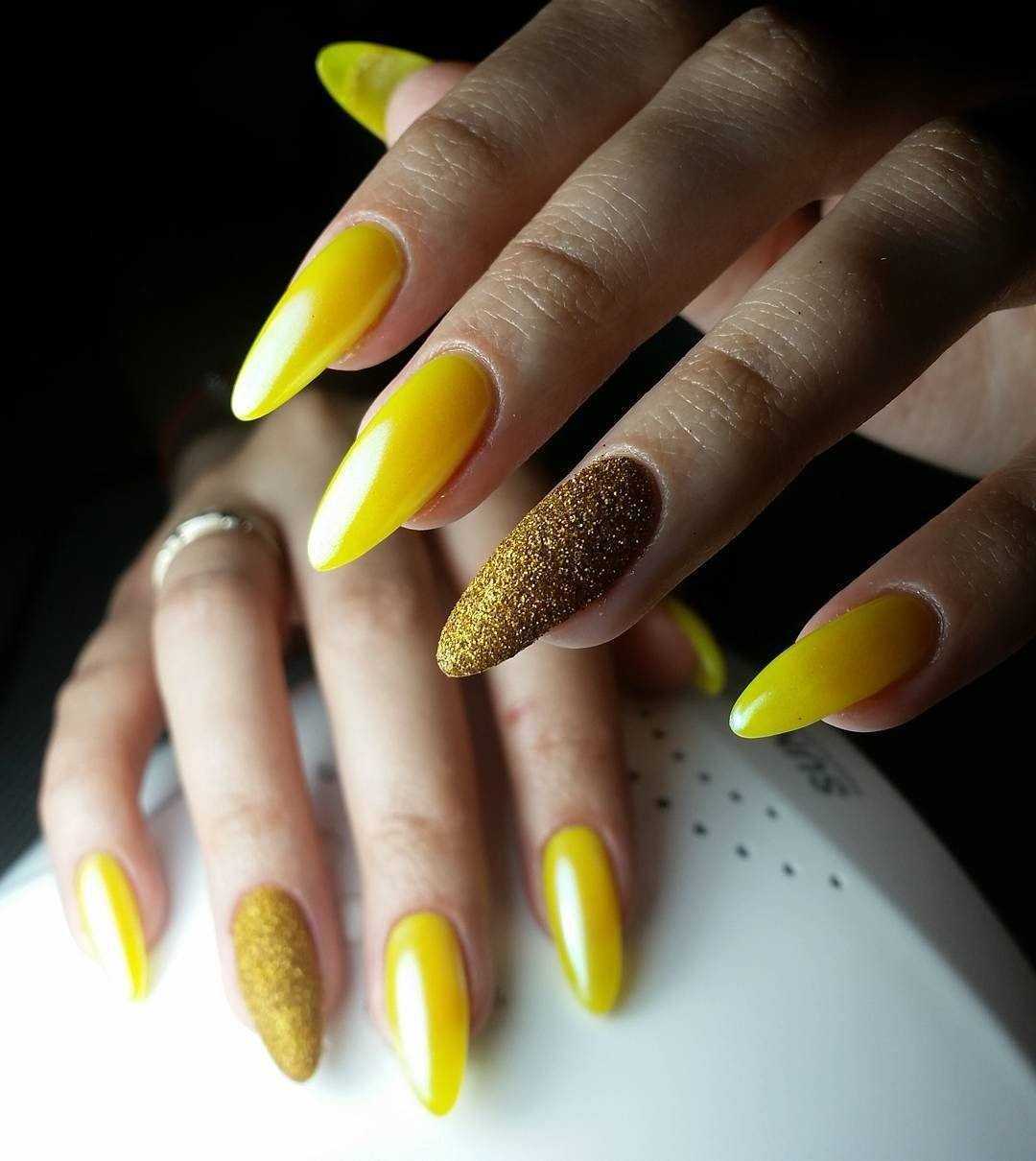 Длинные ногти всегда дают нам почти безграничную основу для творчества. На длинных ногтях беспроигрышно будет смотреться и яркий желтый, и приглушенный с блестящим дизайном, и просто золотисто-желтый, серебристый или жемчужный глиттер. Единственная опасность заключается в том, чтобы не перенасытить маникюр блестящими материалами. Поэтому, берем на вооружение понравившийся оттенок желтого цвета и выбираем, не теряя при этом чувство умеренности и вкуса, блестящий дизайн. Это может быть и втирка на желтую основу или желтая втирка на белую основу, и красивый узор, рисунок из золотисто-желтого глиттера, а также любимое многими сочетание желтого и разных других цветов, оттенков на разных ногтях.